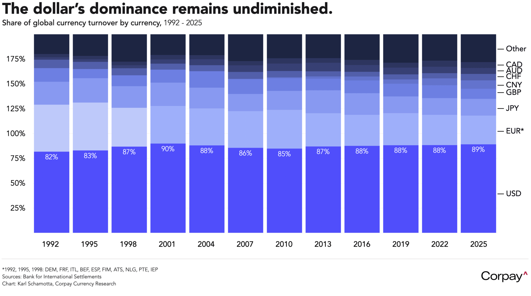Why might this prove relevant for currency hedgers? Despite an explosion in claims to the contrary, the dollar remains just as dominant in currency markets as it was in the early nineties, and we think the ‘dollar smile’ rubric for understanding foreign exchange market dynamics remains largely intact. If a correction in richly-valued equity markets unfolds, the greenback could surge against its rivals as participants unwind cross-border debt exposures and seek liquidity. Building “tail risk” protection against unexpected moves is an entirely reasonable response to today’s market conditions.