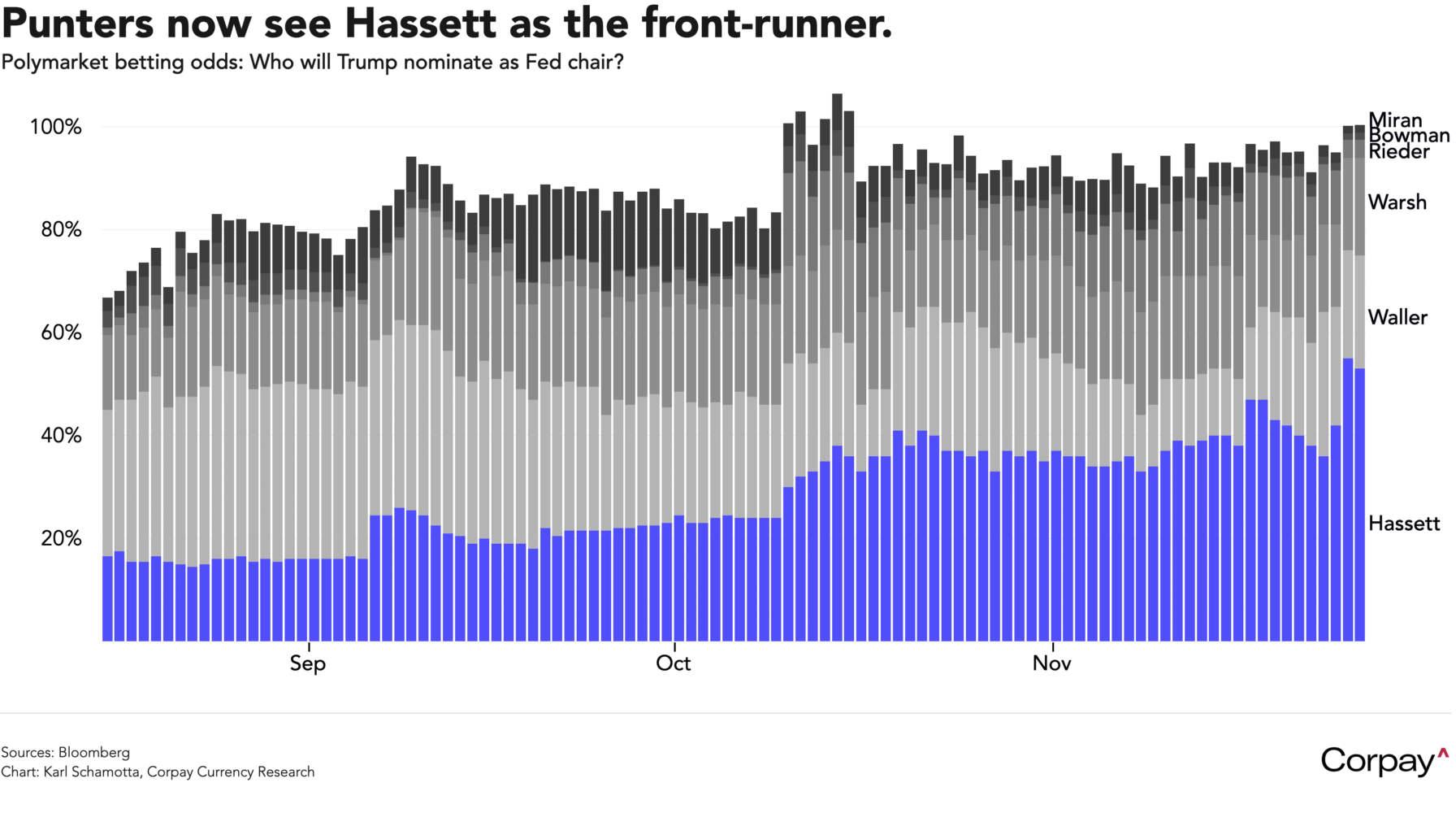Currencies are trading on a mixed footing this morning as investors pivot from expecting some Federal Reserve easing to anticipating too much. The dollar slumped, equity markets rallied, and yield curves shifted in yesterday’s session when Bloomberg reported that Kevin Hassett had become the front-runner in the race to replace Jerome Powell at the head of the world’s most powerful central bank. Hassett—now heading the National Economic Council and once a senior Fed official—is regarded as a capable economist, but also as someone more inclined to heed the president’s call for lower rates, even at the risk of stoking longer-term inflation; markets have duly ramped up bets on aggressive easing next year, steepening the curve on expectations that price pressures will be allowed to run hotter. Treasury Secretary Scott Bessent says Donald Trump will make his final choice by Christmas.