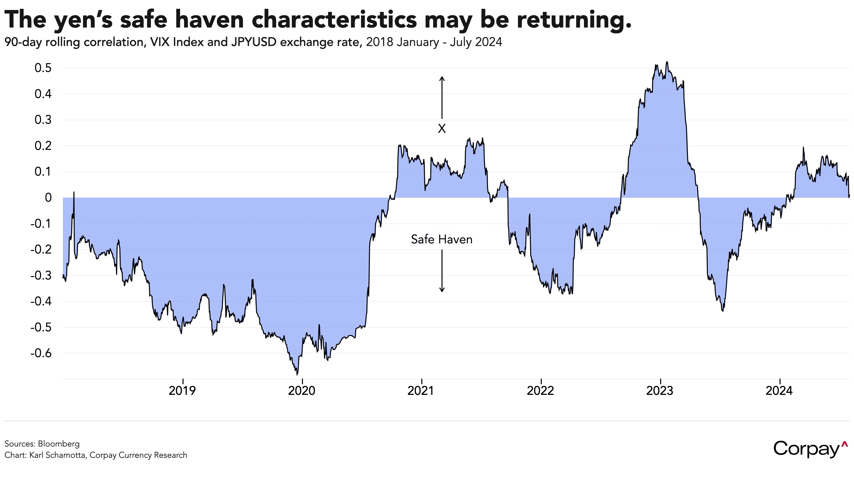 The yen’s “safe haven” characteristics seem to be returning after dissipating during the early post-pandemic period. 90-day negative correlations between the VIX volatility index—Wall Street’s “fear gauge”—and the exchange rate look set to come back, with the 10-day measure already showing the yen rising whenever the VIX climbs. To us, this suggests that Japanese authorities have successfully introduced two-way exchange rate risk in their recent intervention efforts, that Japanese onshore investors are beginning to alter overseas asset deployment, and that carry traders are exiting yen-funded positions in a hurry whenever global risk sentiment takes a hit. If so, the “risk on, risk off” trading dynamics that drove currency markets between 2010 and 2019 could be on their way back.