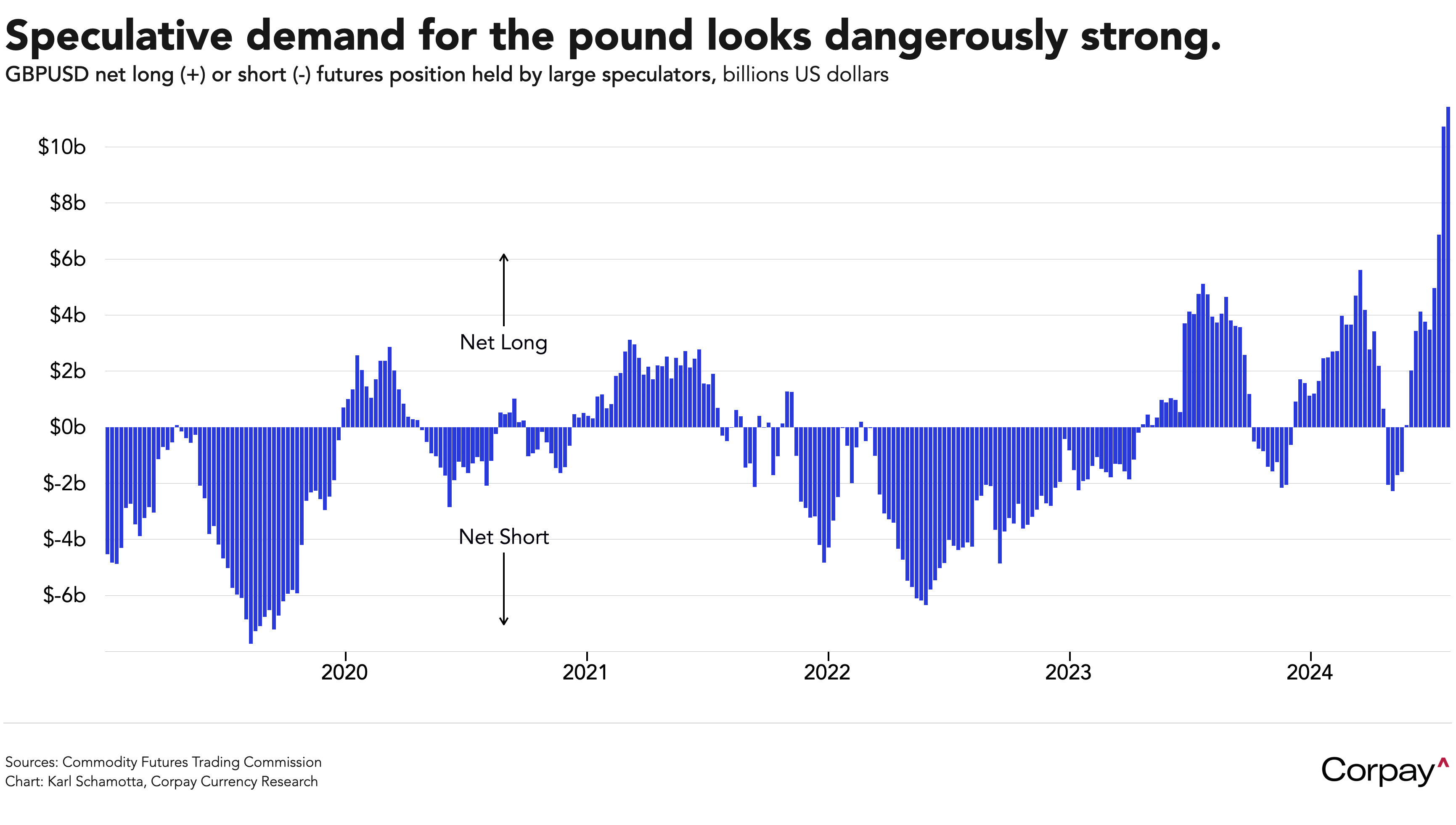 A cut, especially if paired with dovish forward guidance, could trigger dramatic moves in the exchange rate. Markets are currently placing 50:50 odds on a move, with two cuts priced in for the remainder of the year, but with speculators crowded into long positions—speculative bets on the pound hit post-2008 highs last week—the risk of a “fast money” unwind looms large.