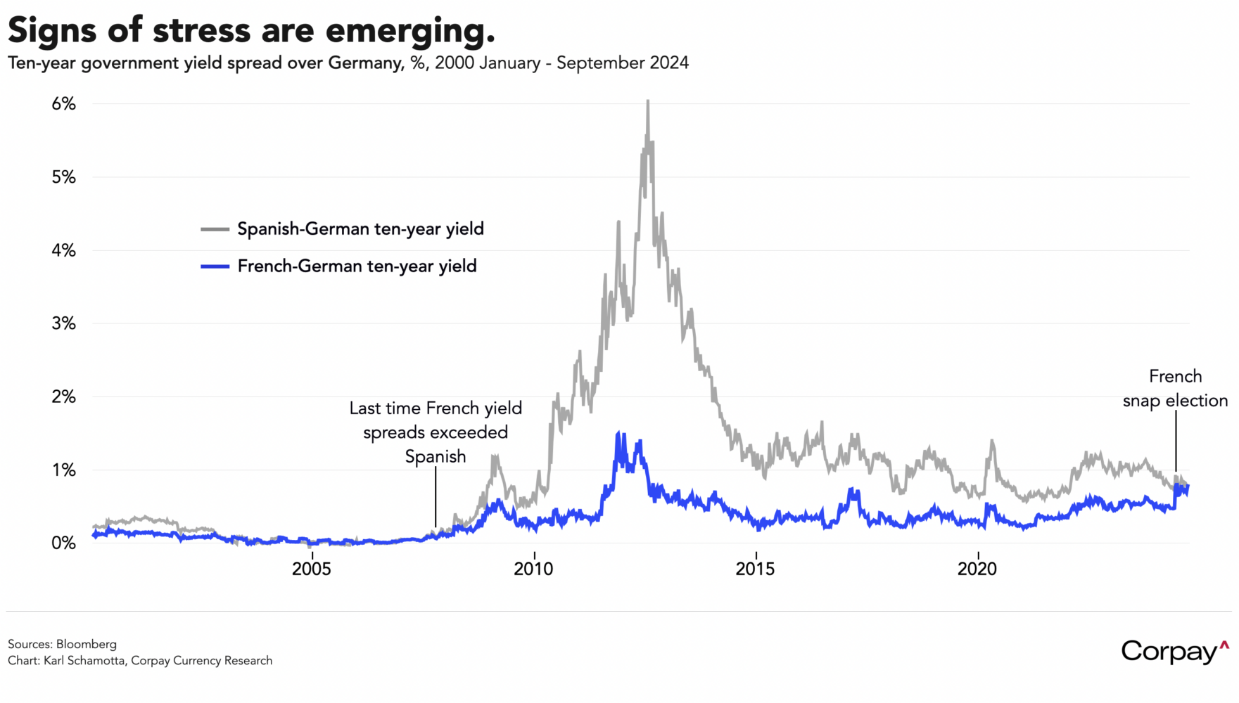 Euro area yields are tumbling, and rate differentials have widened against the common currency, but signs of strain in intra-euro spreads are still there. The premium embedded in French government bonds relative to their German equivalents surpassed Spain’s during yesterday’s session for the first time since 2007, suggesting that investors are growing increasingly concerned about the country’s long-term fiscal direction as political dysfunction in Paris continues.