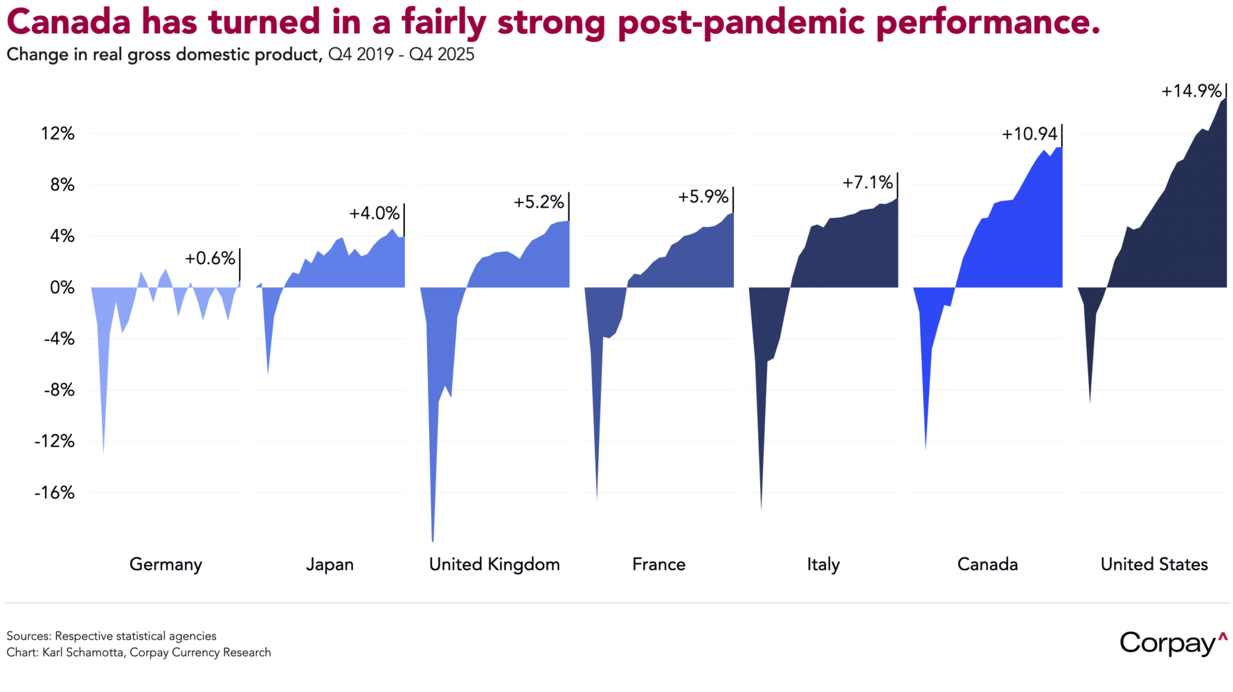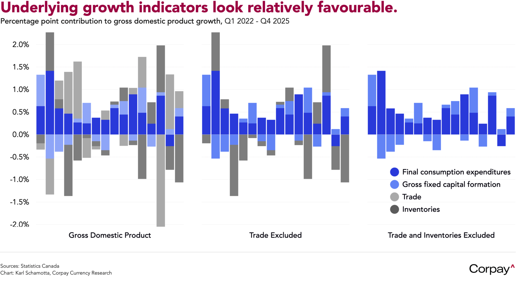 The Canadian economy shrank more than forecast in the fourth quarter of 2025, but measures of underlying growth showed signs of stabilising, helping reinforce market bets on a prolonged hold from the Bank of Canada. Numbers released by Statistics Canada this morning show real gross domestic product contracting at a -0.6-percent annualised pace in the three months ended December—undershooting market expectations for a -0.2 percent decline—but this was heavily driven by a drop in business inventories that could correct slightly in the quarter ahead. Business investment increased 2 percent, household consumption rose 1.7 percent, and domestic demand climbed 2.4 percent. A preliminary estimate showed real gross domestic product flatlining in January, signalling a soft kickoff to 2026.
