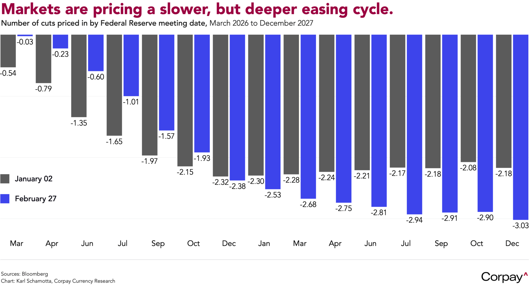 Relative to early January, markets are pricing a slower but deeper easing cycle from the Fed. In our view, two forces are pulling in opposite directions across different horizons: sticky inflation—partly stoked by tariffs—and still-resilient growth are curbing the Fed’s appetite for aggressive near-term cuts, while gradually cooling labour markets and the potential for artificial intelligence-led disruption point to lower terminal rates. In accordance with economic theory, tariff-driven inflation should represent a one-off level shock rather than a persistent trend, meaning the disinflationary impulse from weakening demand will eventually dominate and force the Fed’s hand.