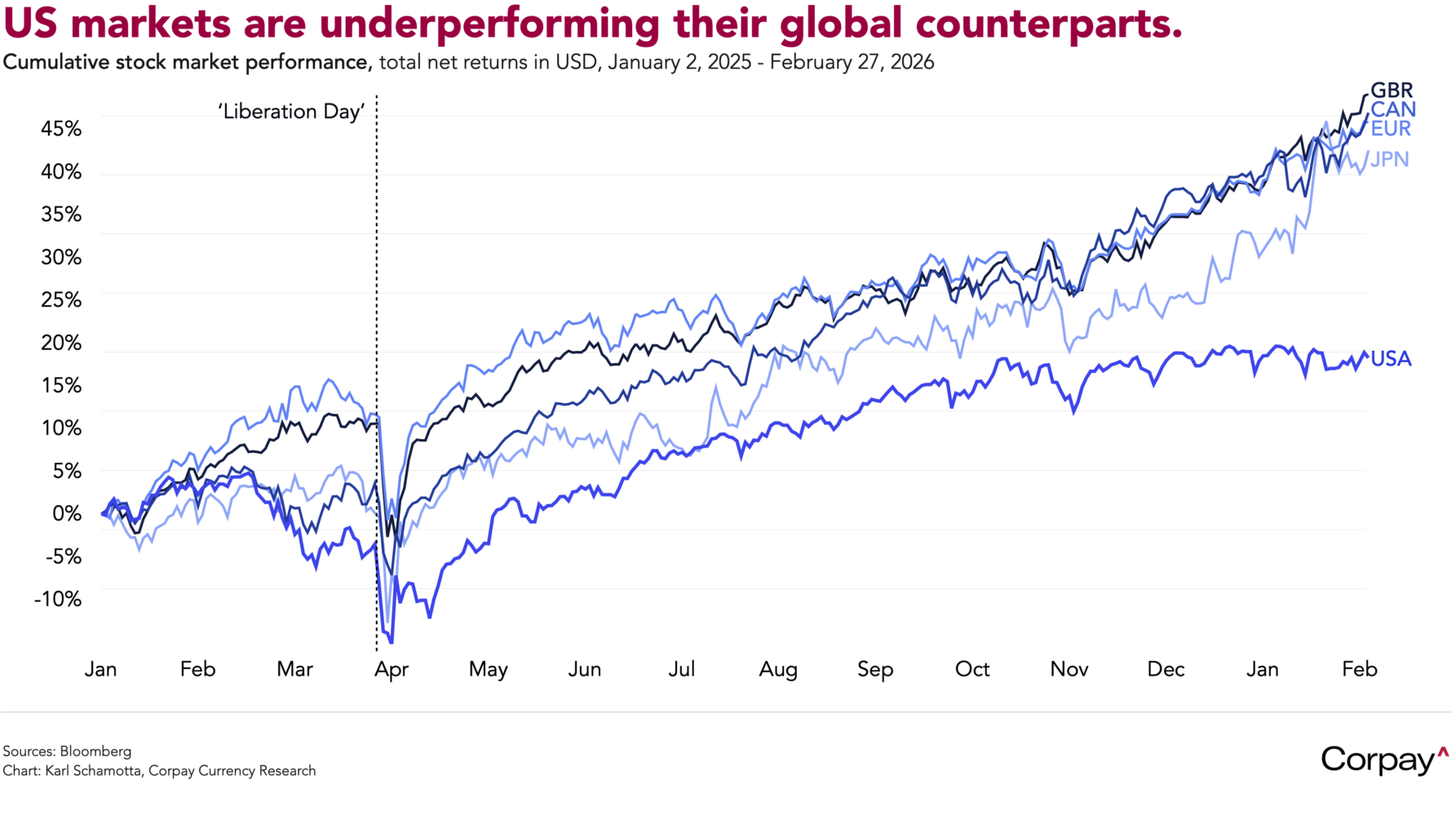 Good morning. Tensions between the US and Iran, doubts about the sustainability of the artificial intelligence boom, and uncertainty over the Trump administration’s tariff plans are restraining risk appetite, leaving most major currency pairs nearly flat against yesterday’s fix. The dollar is trading incrementally softer against a basket of its peers, benchmark ten-year Treasury yields are pushing back below the 4-percent threshold, and US equity indices are preparing to close out the month with losses. Breaking with past patterns, the US MSCI total return index is up 18 percent since January 2025, while the rest of the world is up 44 percent.