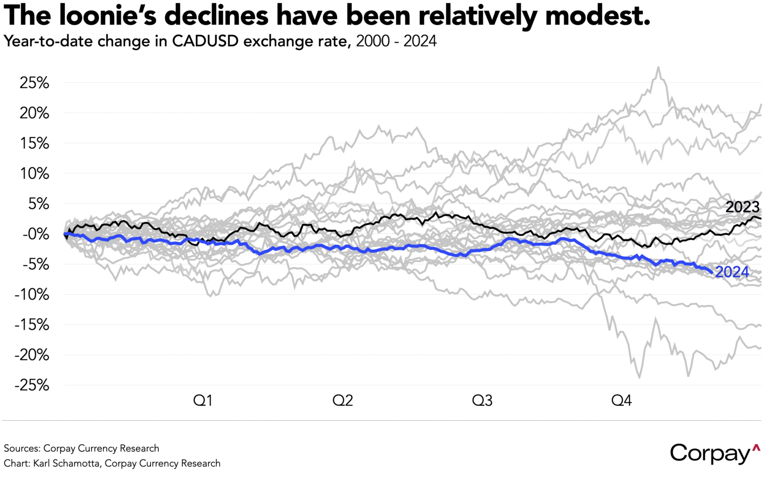 A softer-than-anticipated print could add to downward pressure on the loonie, but we think losses should be fairly minimal. There has been much rending of garments and gnashing of teeth in the Canadian media over the currency’s decline this year, but from a historical perspective, trading ranges have remained subdued and the downward move has been fairly tame in percentage terms: