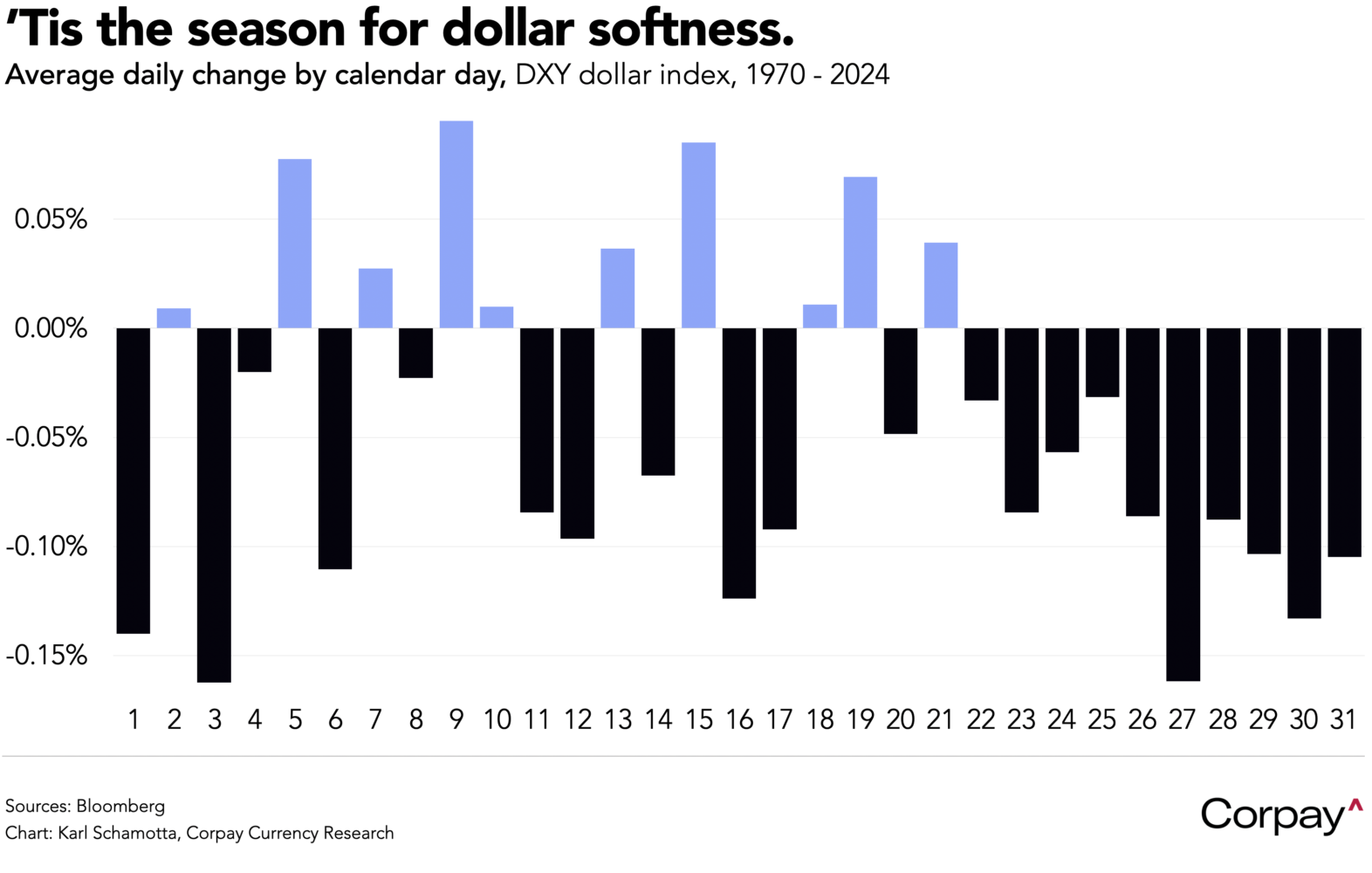 From a broader perspective, it’s fair to expect typical seasonal dynamics to begin putting downward pressure on the greenback in the weeks ahead. A more hawkish-than-anticipated Fed decision could upset the apple cart—counter-trend funding squeezes have seen the dollar spike higher in previous years—but currency markets are often dominated by mean-reversion trades into year end* as asset managers and hedgers rebalance portfolios.