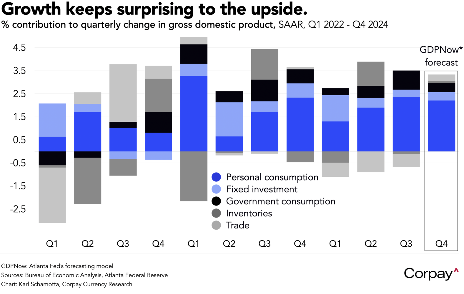 Friday’s US personal income and spending report should not move markets. Economists are fairly united in thinking that the core personal consumption expenditures index decelerated to a 0.13-percent month-over-month pace in November, down from 0.27 percent prior, with base effects lifting the year-over-year print to 2.84 percent from 2.8 percent. And with the Fed’s December decision in the rear-view mirror along with another print due before the January meeting, the implications for monetary policy will be limited.