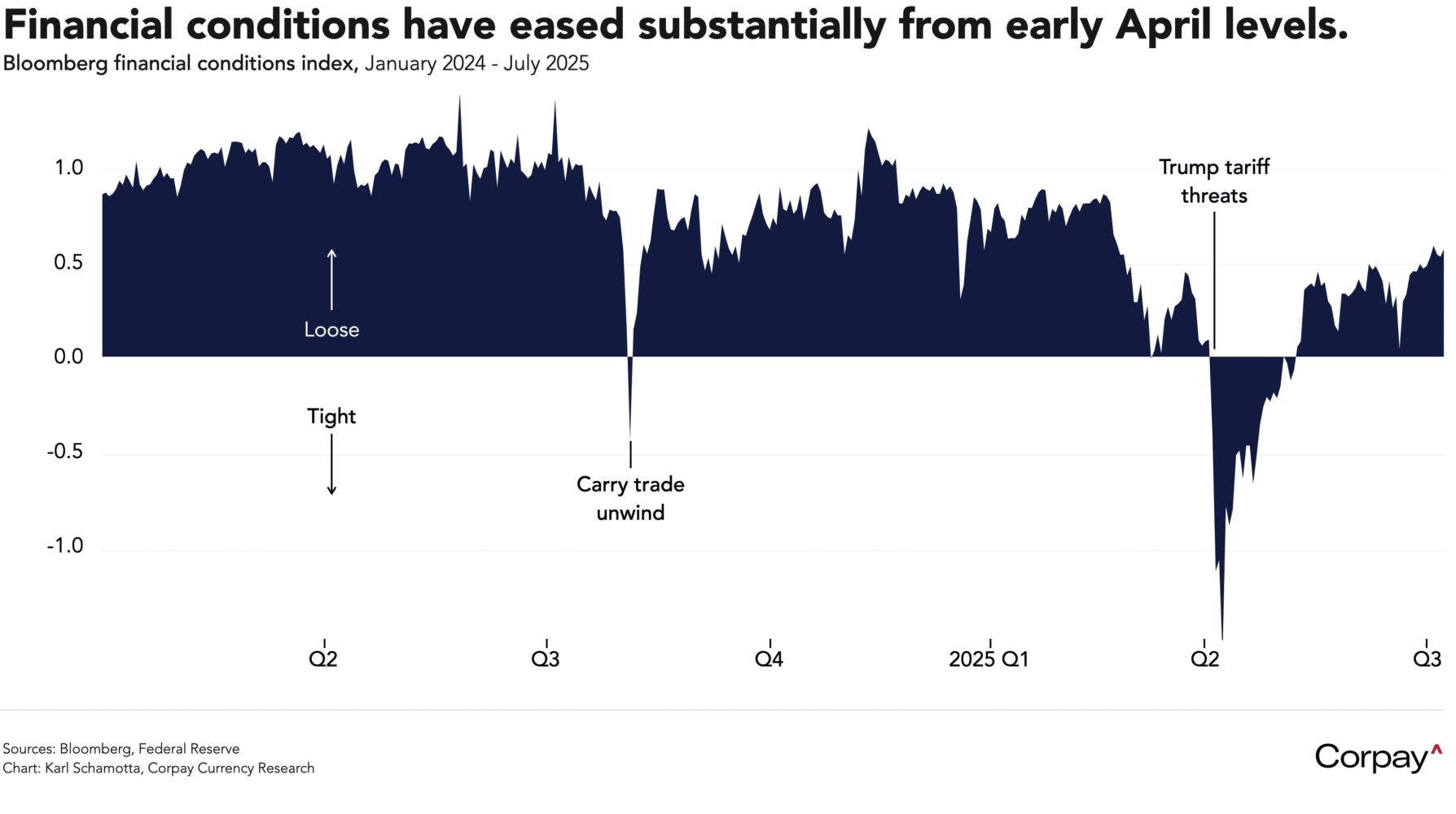 **Financial conditions indices are designed to measure the extent to which markets are creating headwinds or tailwinds for economic activity, and include factors like bond yields, lending spreads, mortgage rates, exchange rates, and stock market valuations. When rates are rising and stock markets are falling, the financial sector is generally believed to be restricting growth, while the opposite set of conditions tends to boost the economy.