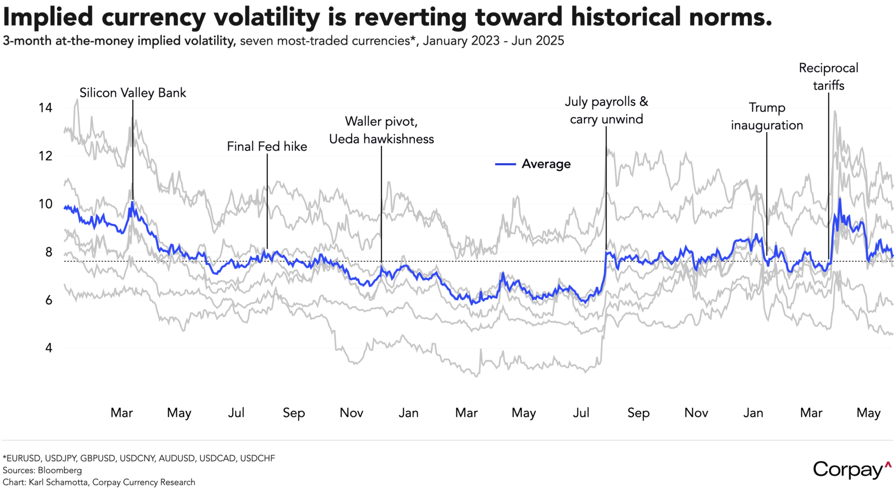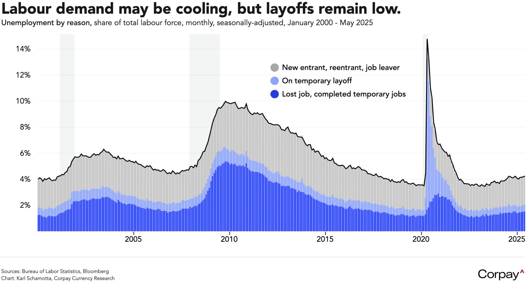 Friday’s nonfarm payrolls report reduced pressure on the Federal Reserve to cut interest rates. Signs of cooling demand in the labour market were evident – job creation in the previous months was revised down by 95,000 positions and layoffs kept creeping higher – but the American economy added another 139,000 jobs and the jobless rate held steady near levels consistent with theoretical estimates of “full employment”. Traders now expect just one additional rate cut by year end – and real yield differentials are back to playing a somewhat dollar-supportive role – as policymakers watch economic conditions evolve and await clarity on the government’s budget and trade policies.