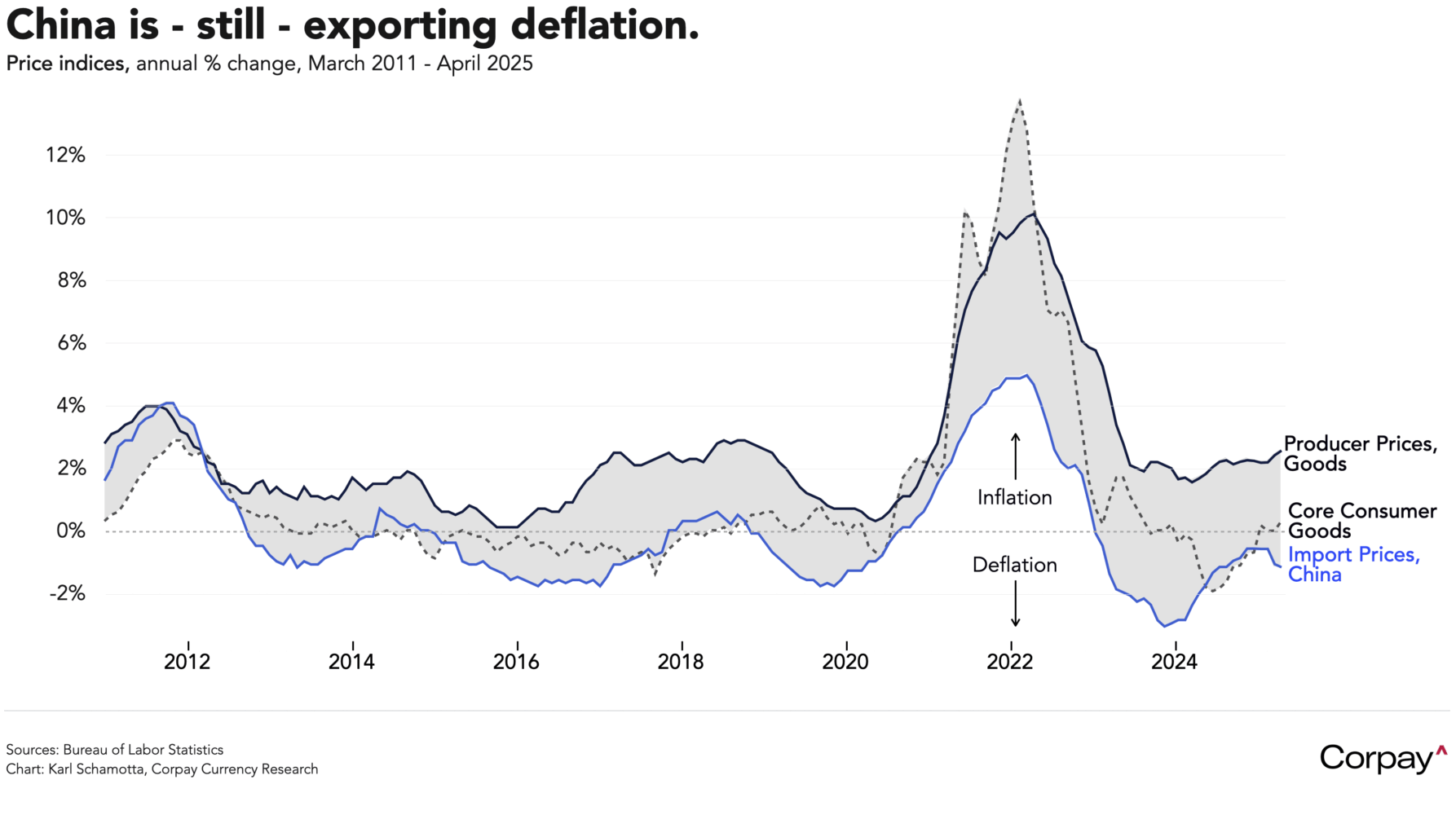 Markets don’t expect tariff-driven price increases to show up in a significant way in this week’s US inflation updates. Wednesday’s May consumer price report and Thursday’s producer price release are both expected to feature a slight firming in tangible goods costs as onshore suppliers begin to pass tariff increases along to customers, but this should be offset by declining input costs from China – an update yesterday showed factory-gate prices falling 3.3 percent in May from a year earlier, marking the steepest contraction in 22 months – and by softness in discretionary spending categories on the services side of the equation. June and July numbers should provide a more decisive read on how tariff increases are flowing through into end-user consumer prices.