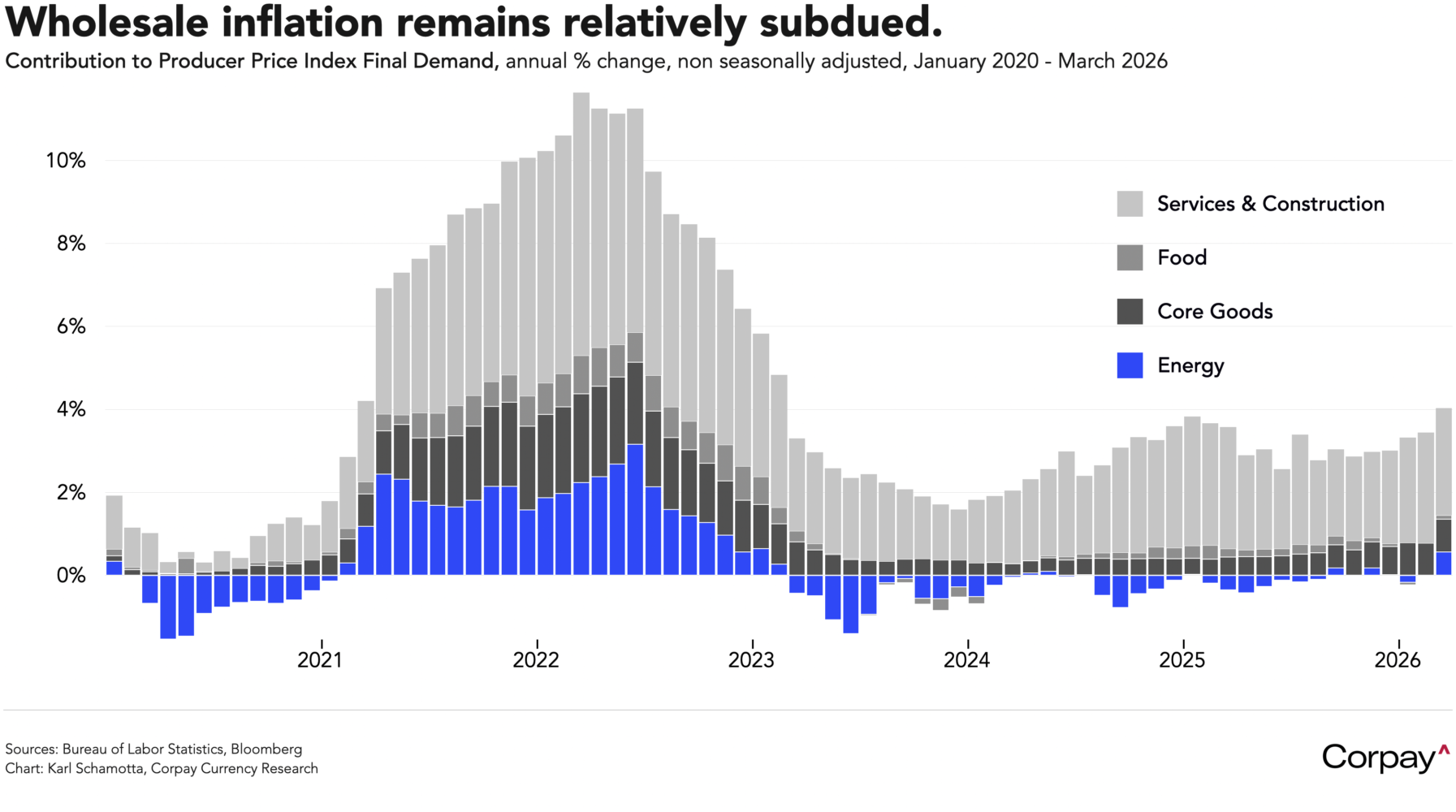 US wholesale prices climbed by less than anticipated last month, affording fixed-income markets a degree of respite ahead of an expected jump in energy costs ahead. The producer price index for final demand—which measures changes in the prices of goods and services produced in the US—climbed 0.5 percent in March after a similar rise in the prior month, the Bureau of Labor Statistics said this morning, undershooting the 1.1 percent expected by economists as oil and gas inputs remained relatively tame. In the 12 months through March, the index advanced 4 percent after rising 3.4 percent in February—a print well below the 4.7 percent consensus forecast, and one consistent with a slightly softer greenback.