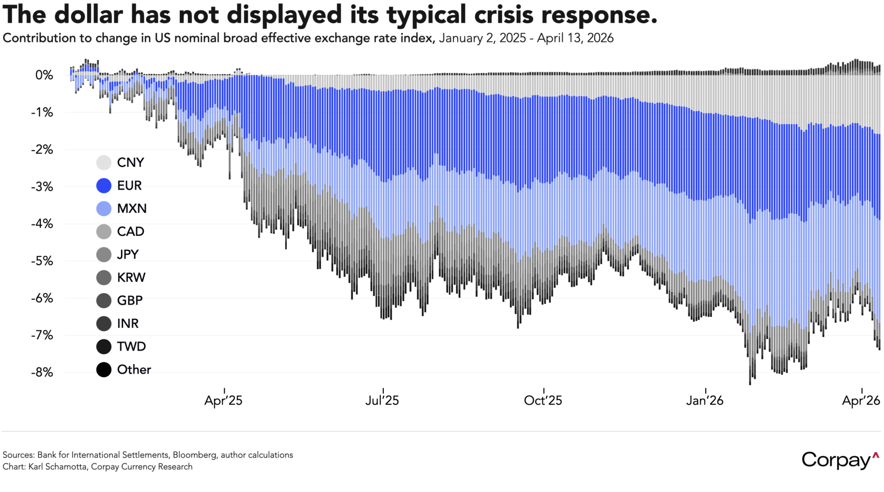 On a trade-weighted basis, the dollar’s wartime rally has now been fully unwound, leaving the currency a touch weaker than it stood on February 28th, the eve of the American-Israeli assault on Iran. In past geopolitical convulsions—the Gulf wars, the September 11th attacks, the early months of Russia’s invasion of Ukraine—the greenback surged as global capital sought the safety of American assets. This time it barely budged. Even as oil prices leapt by roughly 60% and risk premia spiked, the dollar managed a gain of just 2.6%—far less than a disruption of this magnitude would ordinarily produce.