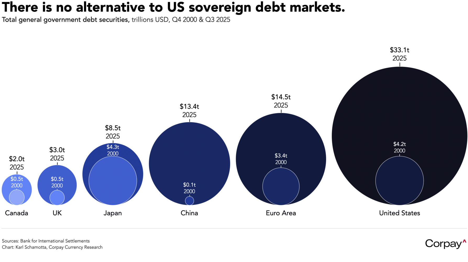 Talk of the dollar losing its dominance should be treated with scepticism. Erratic American policymaking, persistent questions about Federal Reserve independence, and mounting concern over the country’s fiscal trajectory have all corroded the currency’s standing as the world’s unimpeachable safe haven. Yet the alternatives remain feeble. The renminbi is tightly controlled, internationally illiquid, and vulnerable to political interference; the euro is hobbled by dysfunction in Brussels and moribund growth; and markets elsewhere are far too shallow to intermediate global capital flows. The network effects that underpin the dollar’s share of foreign-exchange reserves*, cross-border debt issuance, and trade invoicing are not about to dissipate.