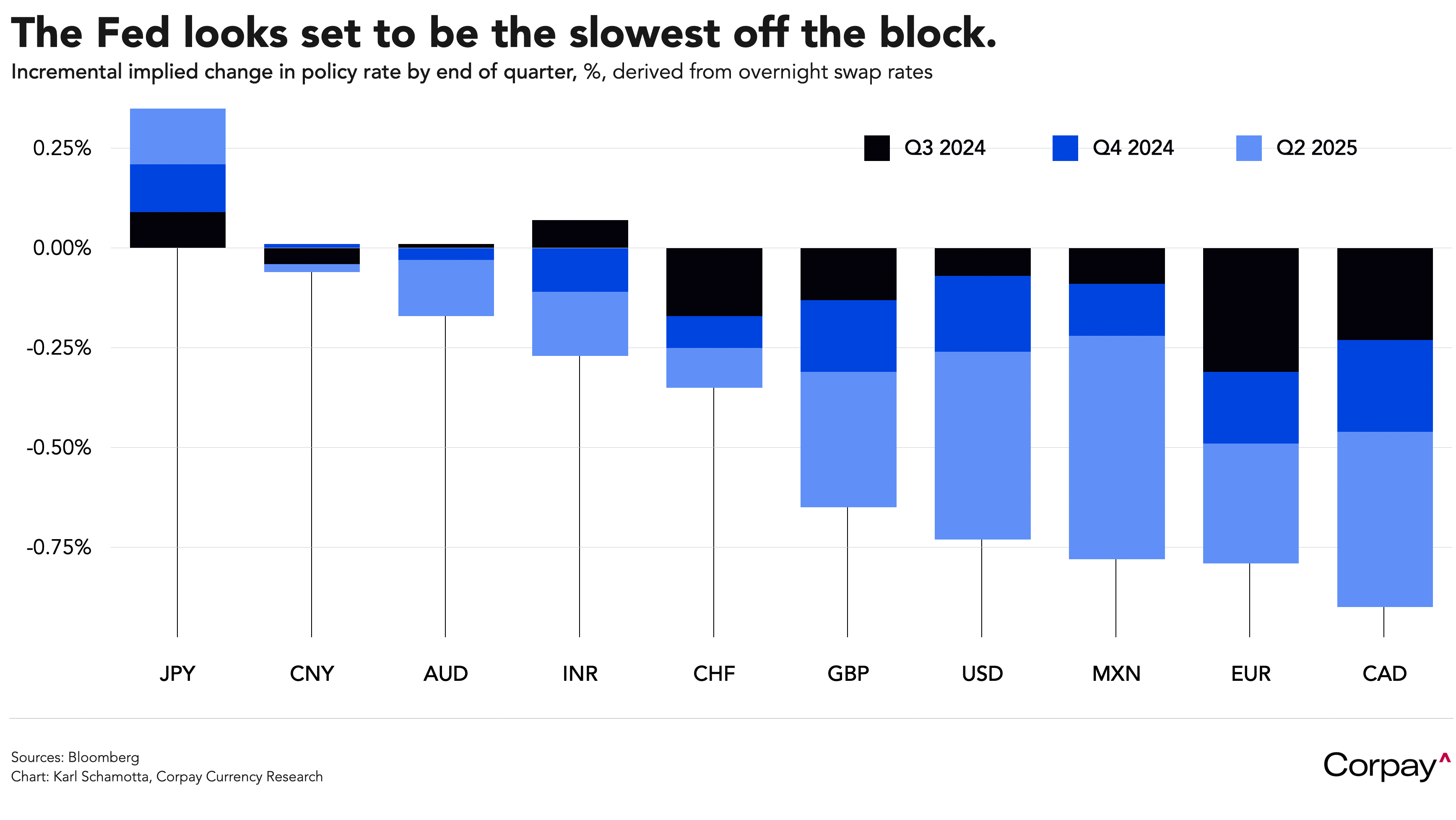 Friday’s non-farm payrolls report forced traders to push the expected initiation of the Fed’s easing cycle further into the future. Job growth surged, with a 272,000-position gain topping market expectations, and wage growth accelerated, rising 0.4 percent month-over-month. Overnight index swaps are currently pricing in 36 basis points in easing by December, meaning that the Fed will likely become the last Group of Seven central bank to get off the starting block this year.