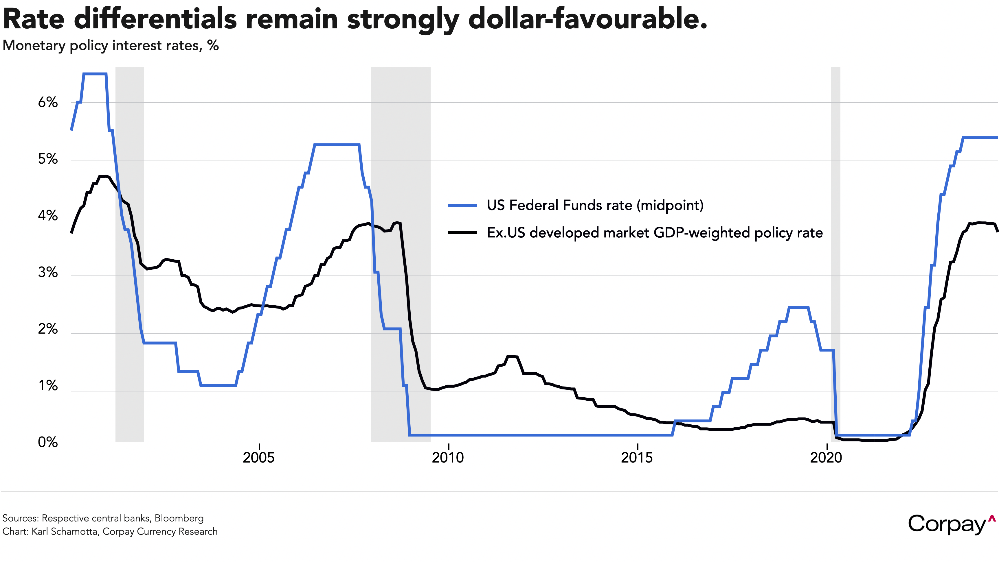 Federal Reserve officials are likely to raise their own policy outlook at Wednesday’s meeting, with the “dot plot” summary of economic projections pointing to two or fewer rate cuts before year-end, down from the three assumed in March. With labour markets remaining strong, consumer spending essentially undiminished, and inflation easing only gradually, Chair Jerome Powell may use the post-decision press conference to outline a slower, more cautious easing cycle ahead. This stance should keep rate differentials – which currently favour the dollar relative to its developed-market counterparts – elevated for now.