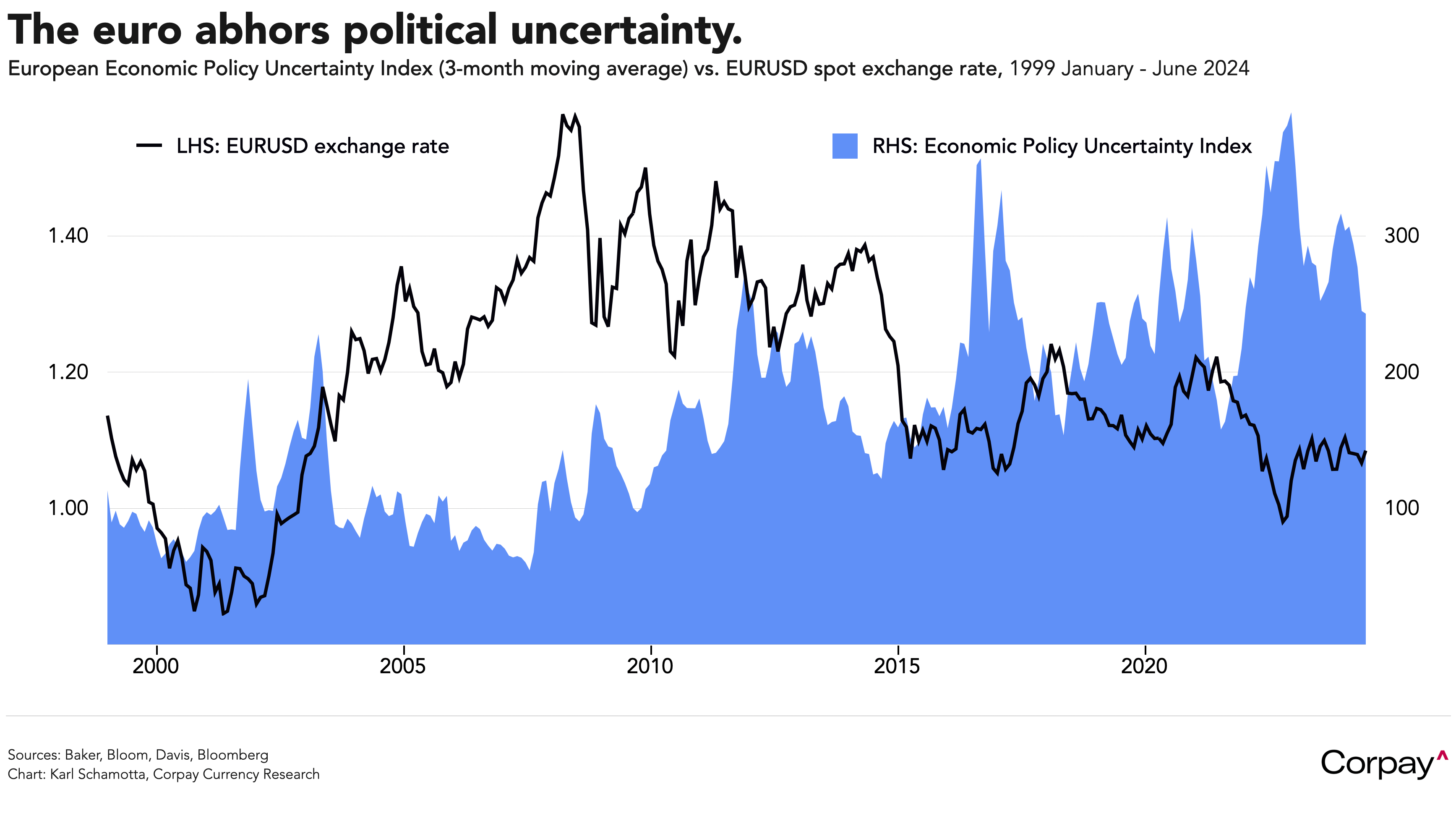 The euro is trading near its weakest levels in a month as political risks climb. Although centrist coalitions preserved their majorities in European Parliament elections over the weekend, far-right parties made serious headway in Germany and France. With Marine Le Pen’s National Rally party capturing more than twice as many votes as the ruling party, president Emmanuel Macron called a parliamentary election for the end of this month, suggesting that he seeks to force the electorate into making a choice between stability and a more radical – and potentially less coherent – vision for Europe’s future. Macron will remain head of state until the next presidential election in 2027, but might be forced to work with an unfriendly prime minister and legislature in the interim.