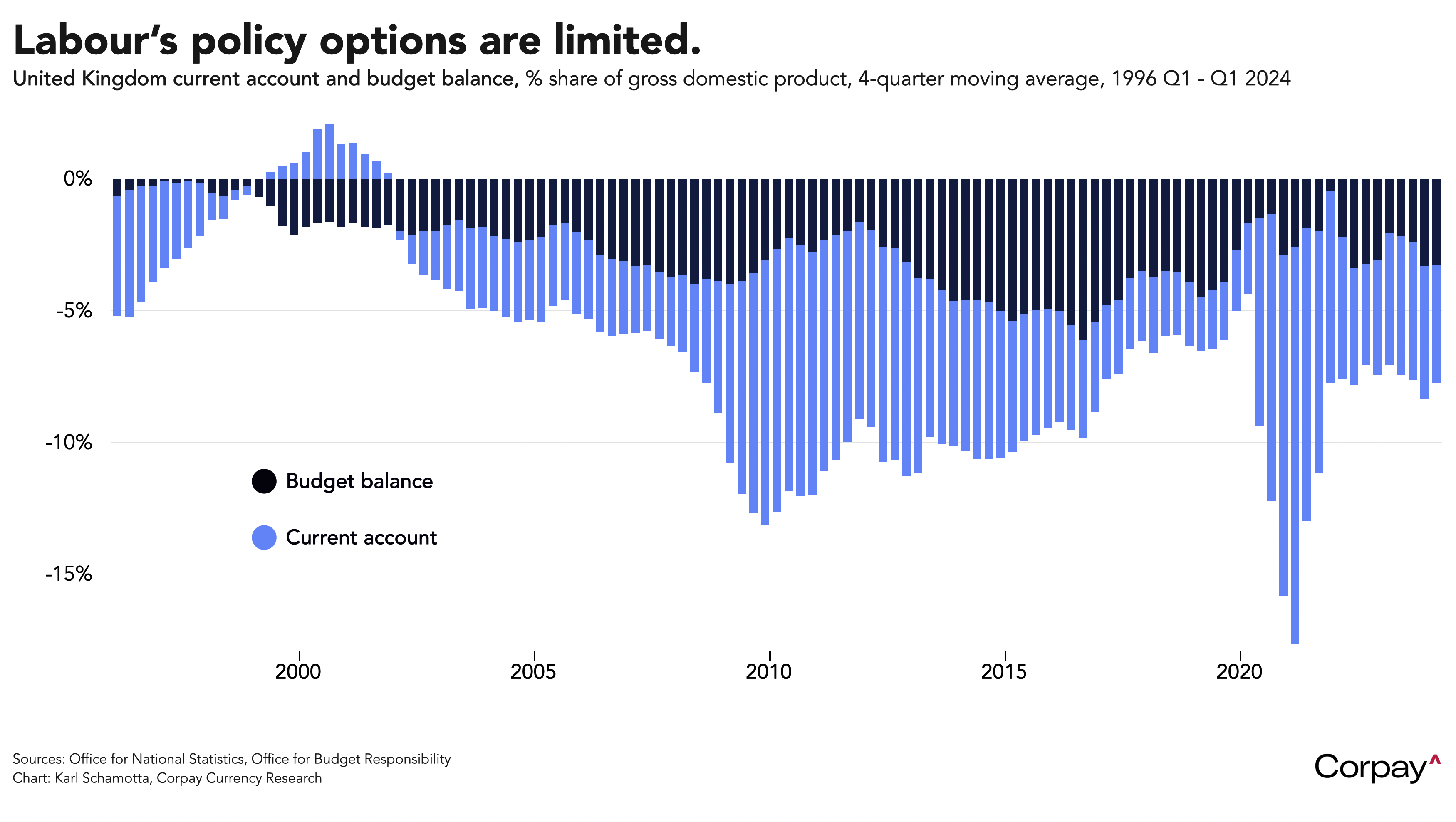 We think this bullish stance is well-founded in the fundamentals, but suspect exchange rate gains will be relatively limited. The UK doesn’t, in Mark Carney’s memorable phrase, really depend on the “kindness of strangers” – the country generally relies on selling down its stock of foreign assets to fund its twin deficits – but does remain vulnerable to the sort of “buyers strike” that took down the Truss administration. By necessity, the incoming administration can’t unleash the sort of fiscal impulse that could dramatically change the economy’s fortunes, and will likely maintain the rhetorical commitment to financial stability that pervaded the campaign.