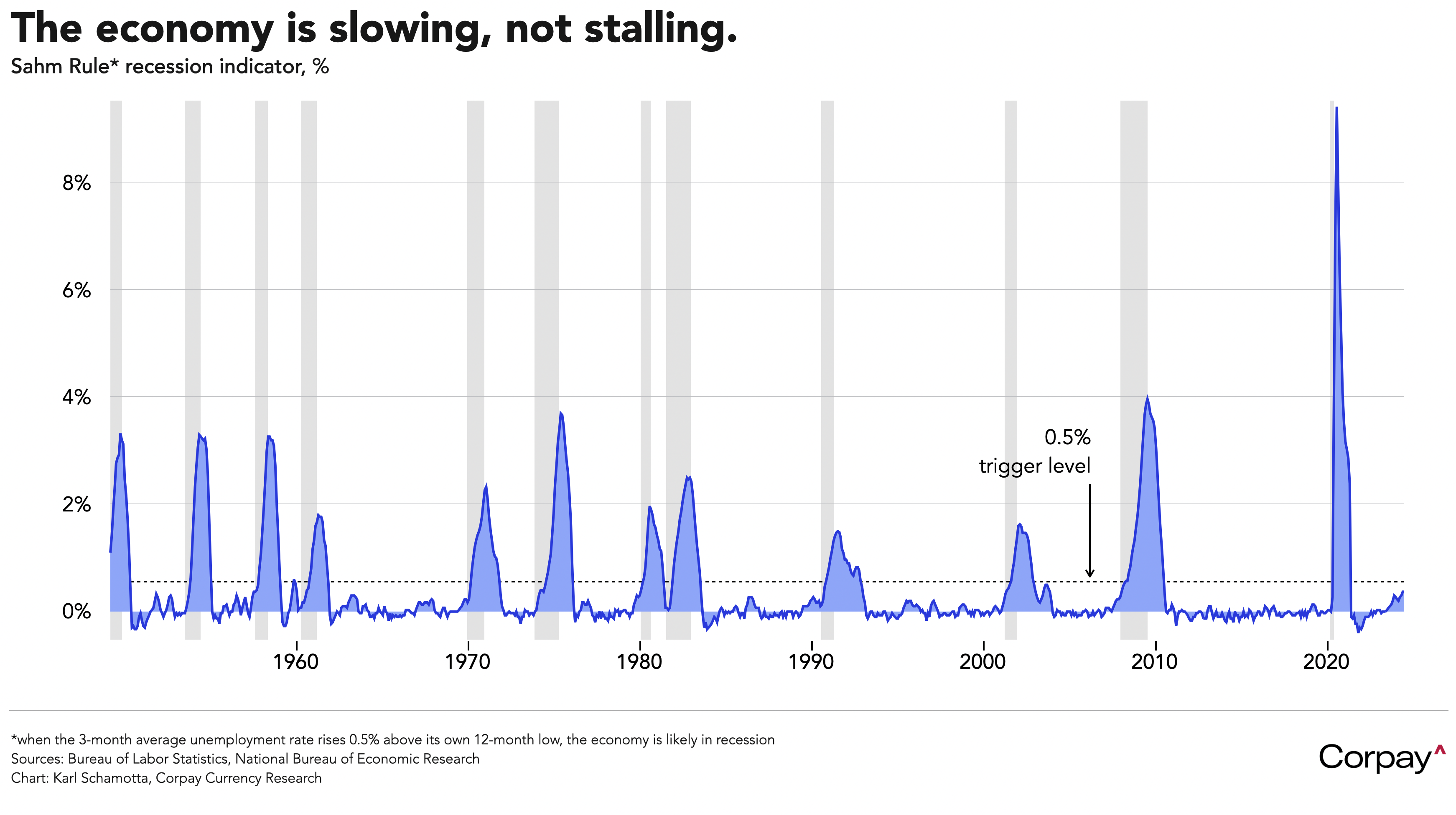 However, although the US labour market is unmistakably cooling, it’s not yet cold enough to make Goldilocks turn up her nose. The ‘Sahm Rule’, which suggests that a recession has begun when the three-month average unemployment rate rises 0.5 percent or more from its 12-month low, has not yet been triggered. By our calculations, the jobless rate would need to jump to 4.3 percent (4.285 percent on an unrounded basis) to confirm an imminent slowdown, and tight conditions are present elsewhere: strong headline gains, a still-low layoffs rate, and an elevated prime-age employment rate are all suggestive of underlying strength. Policymakers at the Fed (the bears in this metaphor) are well on their way home and the greenback should be on the defensive, but are unlikely to knock down the door on today’s print, leaving dollar-favourable rate differentials largely intact for now.