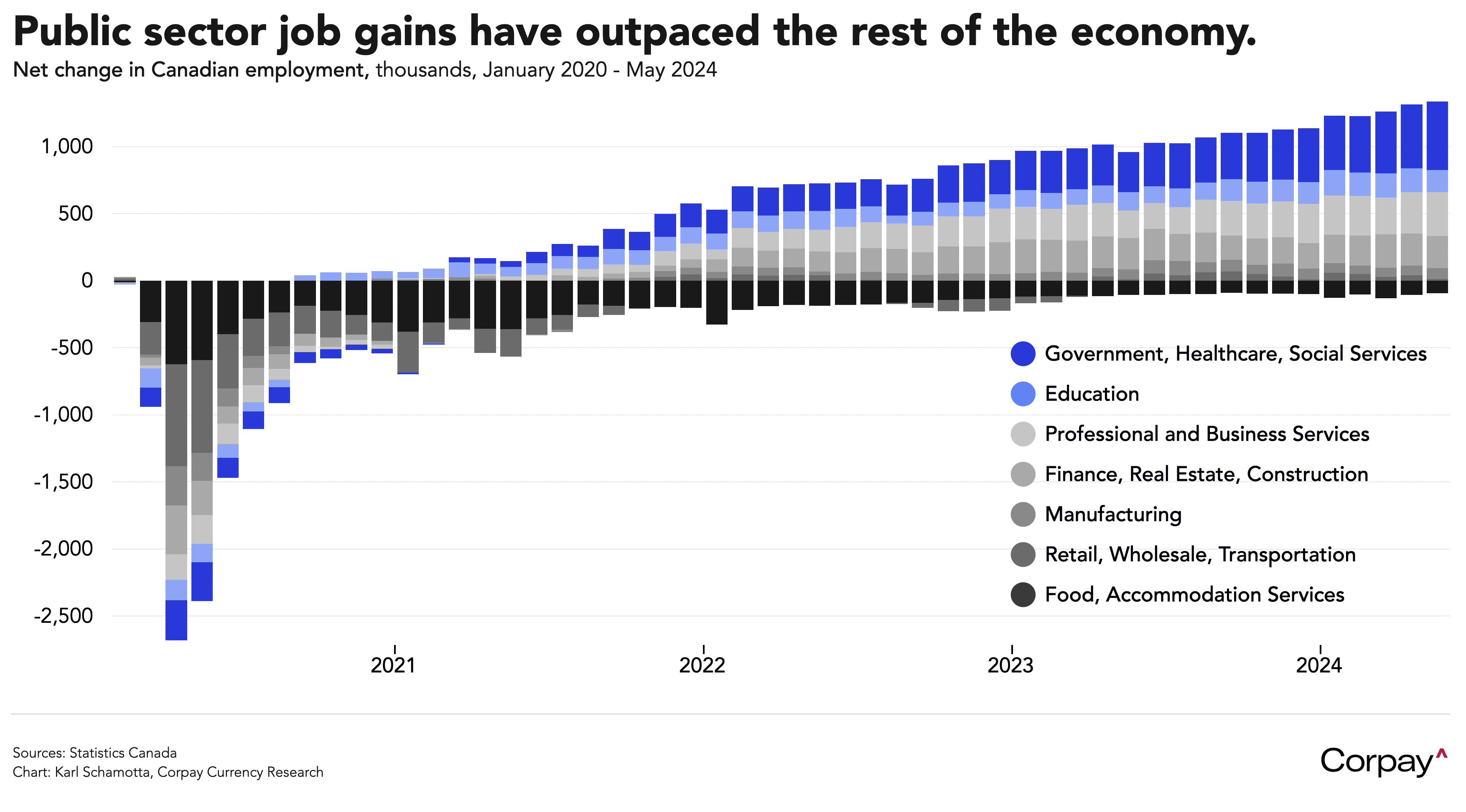 North of the border, Canada is seen printing a modest 20,000-position gain for the month of June, with the unemployment rate rising to 6.3 percent as population growth continues to outpace job creation – although such forecasts have been extremely unreliable amid highly-volatile monthly swings over the last year. The private sector continues to experience turbulence, but three non-business sectors – government, healthcare and social assistance, and education – have generated more than 52 percent of the jobs created in the Canadian economy since the pandemic began, and look set to continue acting as a stabilising force on a three-month averaged basis. This is not supportive of the country’s long-run growth and productivity outlook, and we expect policymakers at the Bank of Canada to maintain a dovish bias even if the headline print is surprisingly positive.