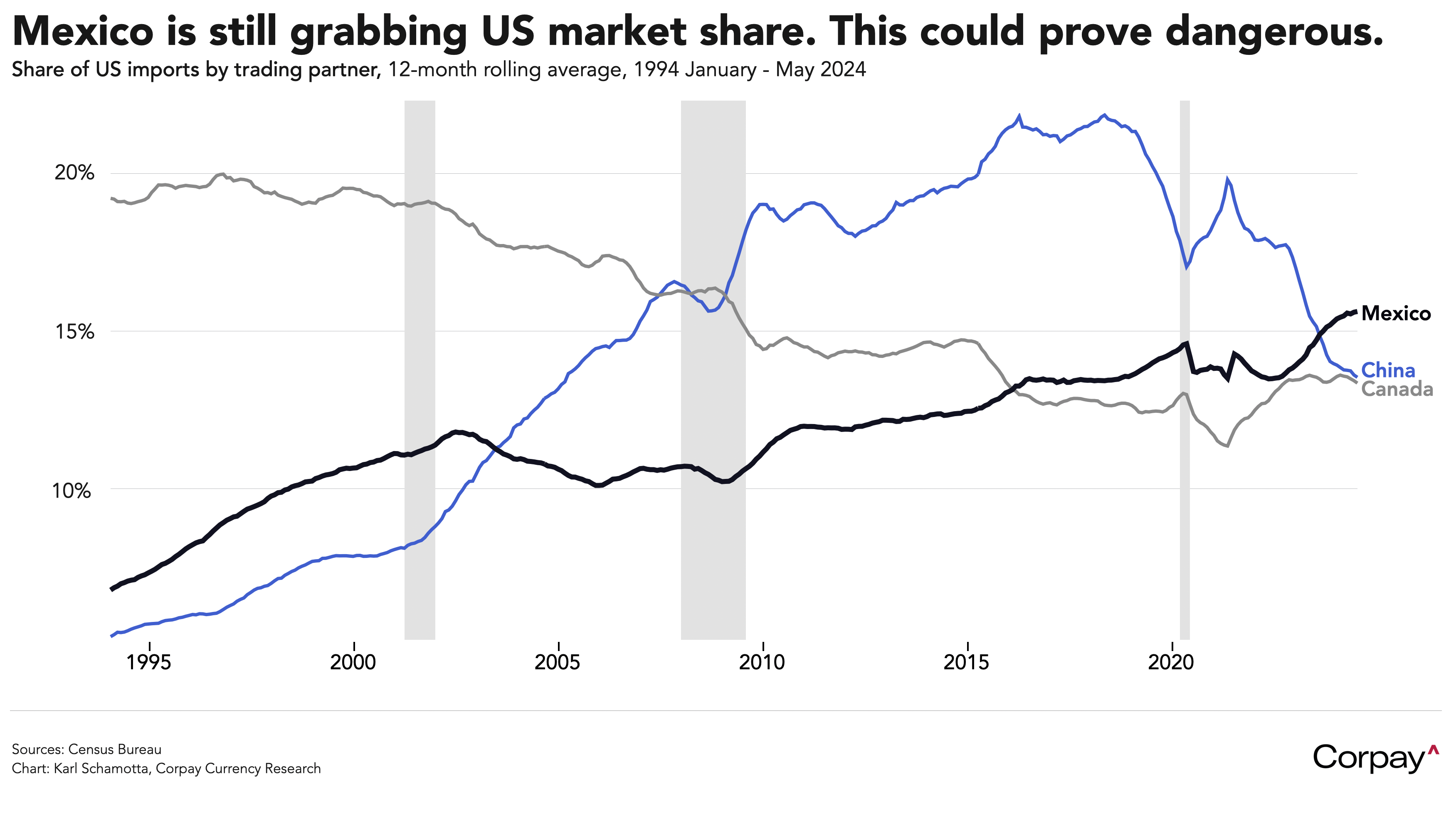 The Mexican peso is continuing its move higher as the dollar falls and president-elect Claudia Sheinbaum works to maintain continuity with the outgoing administration, naming a number of officials who had previously served under Andres Manuel Lopez Obrador to head various ministries. The exchange rate’s sensitivity to domestic policy changes remains elevated – and further debate on constitutional issues could generate renewed selling – but risks are also growing north of the Rio Grande. Data out on Wednesday showed Mexico cementing its lead over China and Canada as the United States’ largest import partner, and threatening to turn the trade relationship into a political football ahead of the presidential election. If US policymakers share our suspicion that some of Mexico’s gains are coming from the transshipment of merchandise in which a significant share of the manufacturing value is added in China, hawkish rhetoric could emerge on the campaign trail, and a significant reappraisal of the US-Mexico-Canada Agreement (NAFTA 2.0) will become more likely.