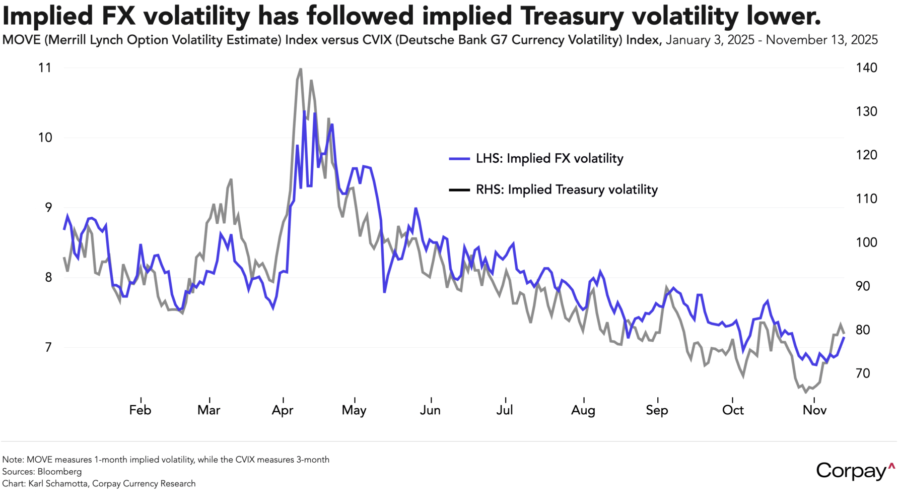 We think this week’s official data releases will have little bearing on foreign-exchange markets. The second-tier indicators due in the days ahead are badly out of date, and Thursday’s non-farm payrolls report is broadly expected to confirm what investors already believe—that job creation was slowing in September—without shedding light on how labour-market conditions have shifted since. With such an incomplete read on the underlying economy, traders are likely to remain wary of taking heavy directional risk, and implied volatility in currency markets—which has mirrored developments in Treasury markets through most of this year—should remain restrained. Data published in early December should prove far more pivotal.
