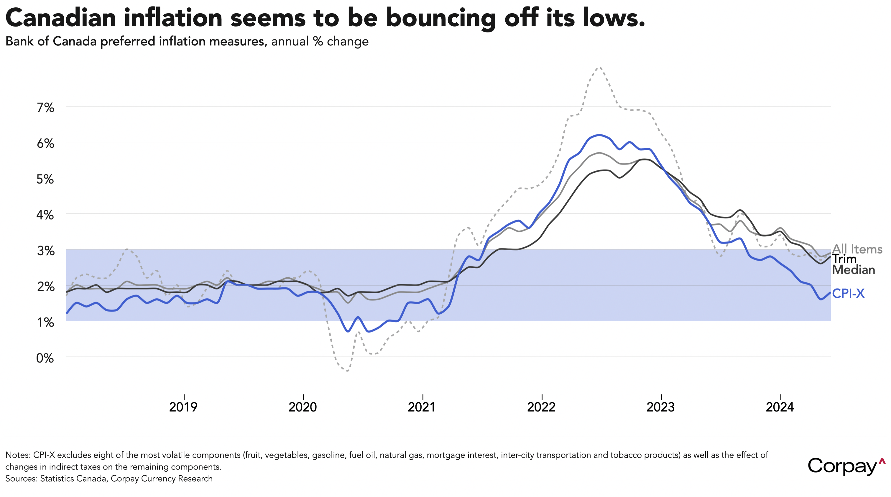 Australia’s data came after a similar shock in Canada, where inflation sped up on both the headline and core levels, surprising observers – including ourselves – who had expected a continued moderation. May’s acceleration was partly driven by a 4.6 percent year-over-year jump in travel costs, but shelter inflation remained incredibly hot, with rents climbing 9 percent and mortgage interest costs surging 23.3 percent. An average of the Bank of Canada’s preferred core inflation measures rose 2.9 percent, up from 2.7 percent in April, and our favourite benchmark – the old CPIX index – snapped its downward slide, rising 1.8 percent after slowing to 1.6 percent in the prior month.