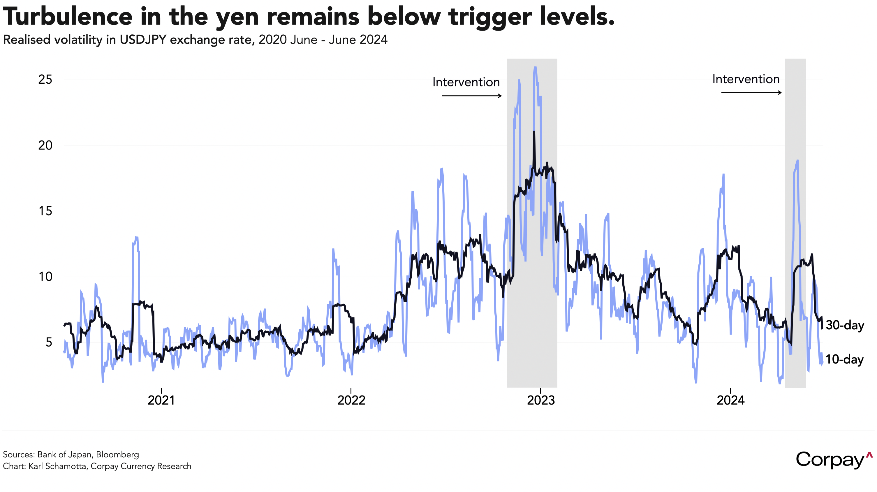 The Japanese yen is trading below the 160 threshold against the greenback as traders bet authorities will remain sidelined for now. With rate hike prospects fading and interest differentials favouring further depreciation, the exchange rate has inched lower in recent weeks, but because trading ranges have remained narrow, realised volatility levels have subsided, and the traditional triggers for official intervention haven’t yet been activated. Markets are growing more confident in the currency moving into a lower trading band, with options markets increasingly assigning strong probabilities to a range between 160 and 170.