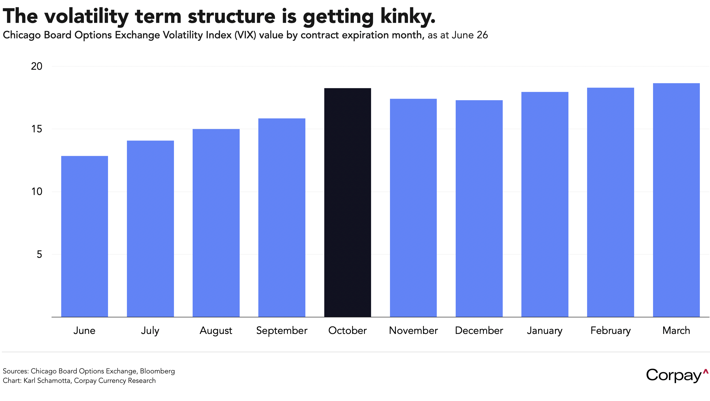 Today’s agenda looks quiet, but tomorrow’s US jobless claims number, Mexico’s central bank decision, and the US presidential debate could move markets in the run-up to Friday’s personal income and spending report. We expect a continued grind higher in applications for unemployment benefits as labour market slack increases. The Banxico is likely to stay on hold while expressing more hawkish sentiments than in prior meetings as officials seek to defend the currency against strengthening outflows. And – despite involving two candidates who have reached an age at which they might be better suited to eating jello than slinging mud – the US debate could see markets adjust the odds on a second Trump presidency, potentially impacting currencies exposed to a resumption of hostile trade actions. Markets remain relatively unconcerned, but Wall Street’s “fear gauge” – the VIX volatility index – is showing a clear peak in the contract month referencing the November election, suggesting that some participants are bracing for more turbulence than typically accompanies US elections.