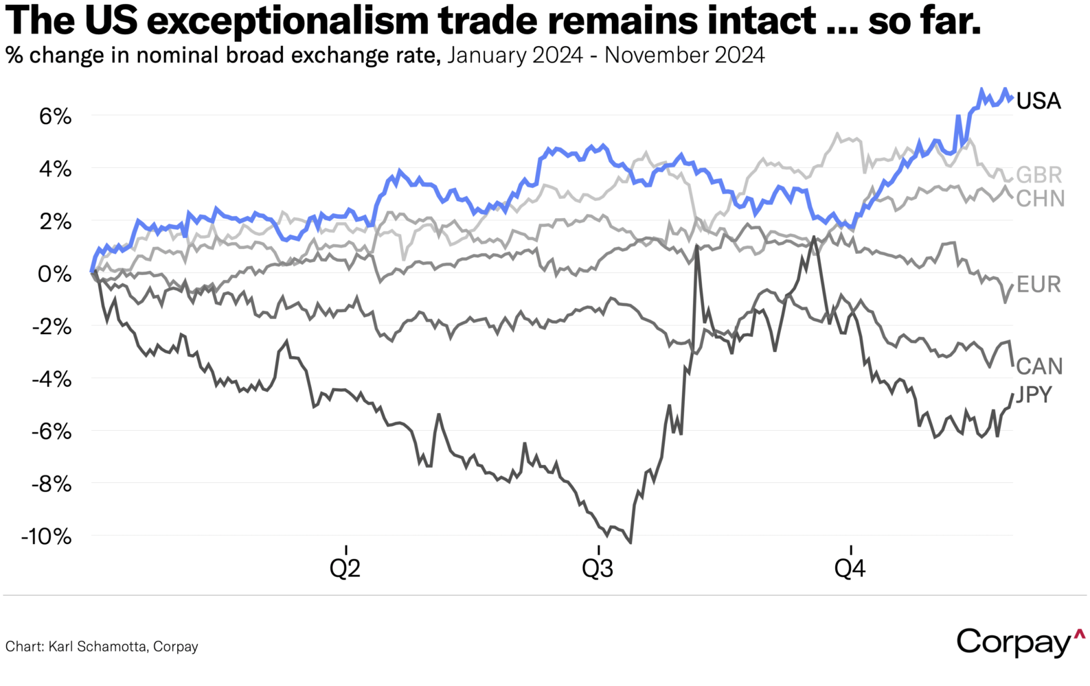 The dollar’s outperformance this year can be seen clearly in the chart below, which shows trade-weighted values through November 27. After softening in the run-up to the Federal Reserve’s first rate cut, the currency has switched direction, surging against all of its major counterparts over the last two months. We don’t expect this to continue for long – at some point, investors will take a more nuanced view on the US economy’s future. But for now, stepping in front of the freight train might be hazardous to any hedger’s health.