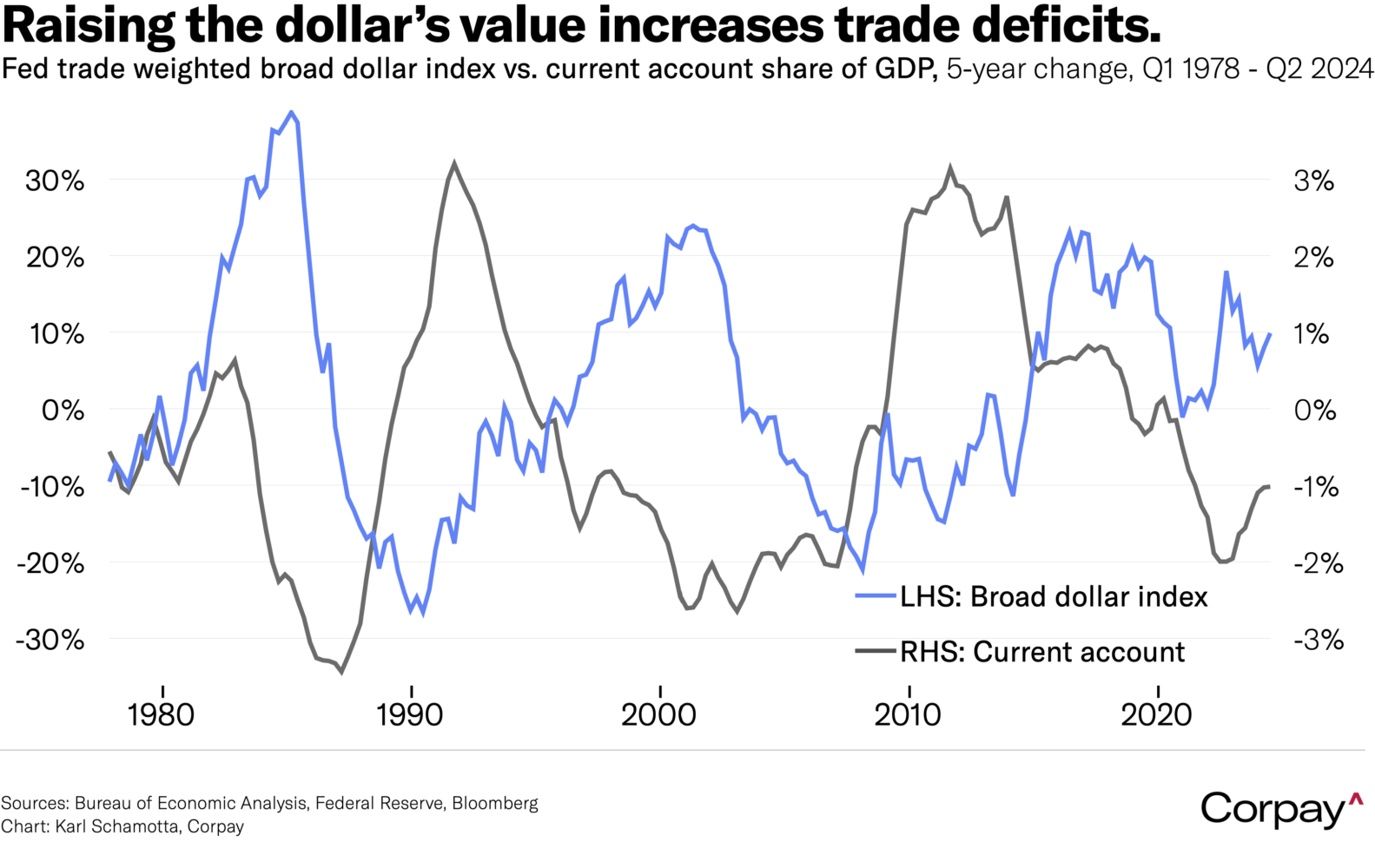 Further, if Trump wanted to reduce US trade deficits, he would be working to lower the greenback’s value, not trying to raise it by forcing foreigners to accumulate dollar-denominated claims. This is because raising the value of the dollar implicitly increases relative US production costs while incentivising consumer spending on foreign products. For many decades, there has been a strong relationship between changes in the value of the dollar and changes in the country’s current account balance. The president-elect’s tariff and currency management messages over the last week achieve goals that are diametrically opposed to his other policy objectives.