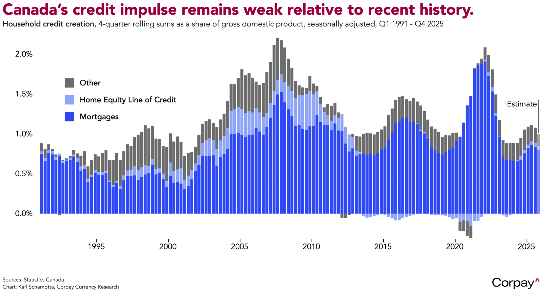 Credit flows to households have dropped sharply from their peak, echoing the pattern seen in the US after the 2008 housing crash. With speculative activity fading and overindebted homeowners growing less willing to extract equity, spending and investment are under pressure, weighing on growth relative to the still-resilient US economy. To us, this backdrop is likely to represent a continuing headwind for the Canadian dollar in the months ahead.