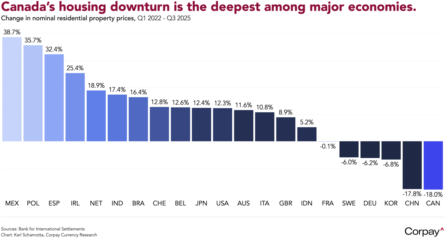 The Canadian dollar remains on the defensive despite avoiding steep tariff increases in the Trump administration’s latest round. That likely reflects lingering uncertainty around USMCA negotiations, with traders braced for disruptive headlines even if the agreement ultimately survives. It also speaks to domestic weakness: Canada is still in the grip of one of the deepest housing downturns in the advanced world. After spectacularly-outsized gains before and after the pandemic, home prices have fallen more sharply than in peer economies and are showing little sign of stabilising.