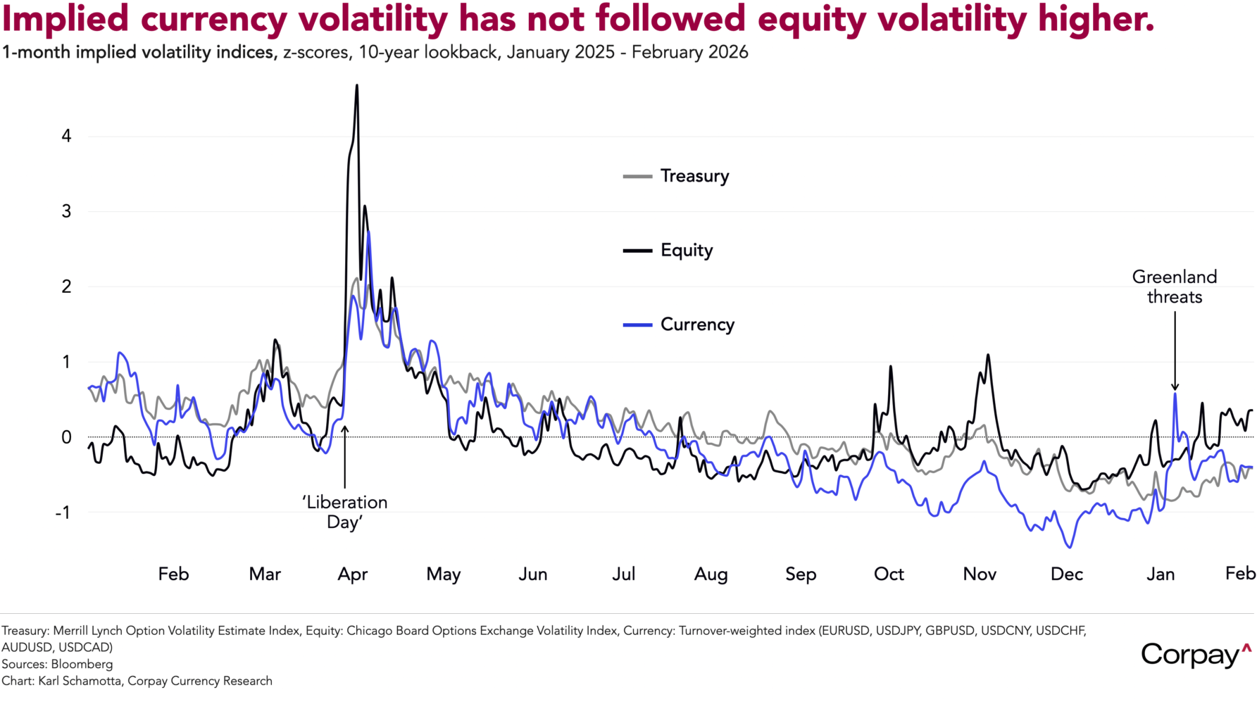 Outside North America, currencies remain broadly rangebound ahead of this morning’s consumer confidence measure from the Conference Board and tonight’s State of the Union address. The euro and pound are treading water against the dollar, the yen is edging lower as Prime Minister Sanae Takaichi pushes back against expectations for further rate hikes, and the Chinese yuan is firming as markets reopen following the Lunar New Year holiday. A slate of Federal Reserve speakers is due in the coming hours, but markets appear well conditioned for a mildly hawkish tone. Instead, geopolitical developments—particularly on the Iran front, and perhaps articulated during Trump’s speech—look more likely to provide the catalyst needed to push exchange rates out of their current holding patterns.
