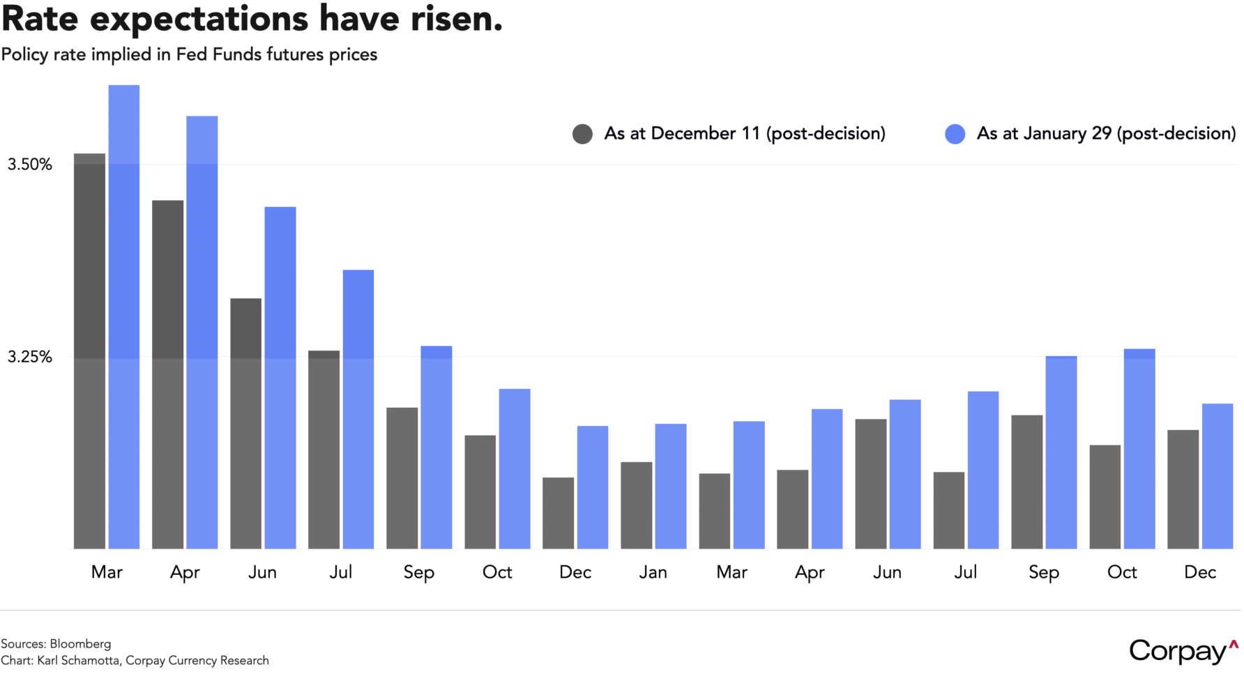 Policymakers at the Federal Reserve paused their easing cycle and indicated they see no pressing reason to move again in the near term, setting the stage for a prolonged pause. In yesterday’s widely-anticipated decision, officials voted by an overwhelming margin to leave rates unchanged, and made a number of adjustments to the statement language to reflect an improving growth backdrop and diminishing downside risks in labour markets. Chair Powell outlined what he called a “clear improvement” in the outlook, noted job markets were delivering “evidence of stabilisation,” and said rates do not appear to be in “significantly restrictive” territory. Market-implied policy expectations moved very little during the decision itself, but remain higher than in December, reflecting a brightening in views on the American economy’s underpinnings and confidence that the Trump administration will ultimately back off in its assault on the Fed’s independence.