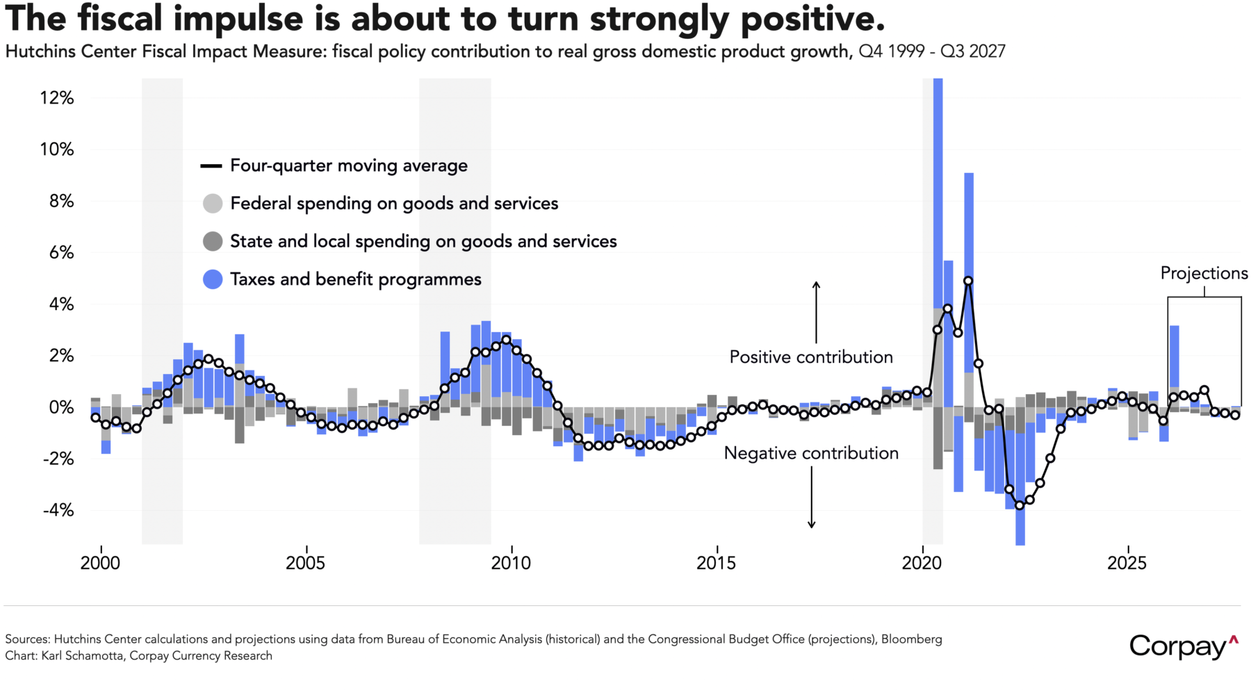 Further gains could be in the offing as a mechanical rebound from the last shutdown plays out and tax refunds resulting from the One Big Beautiful Bill Act are deposited in the coming months. The Hutchins Center Fiscal Impact Measure, which attempts to quantify how government tax and spending policies will affect the economy, is pointing to a growth boost equivalent to 3 percentage points of gross domestic product in the first quarter as spending delays are resolved and tax cuts boost spending among households and businesses. This is on par with the stimulus efforts previously launched during recessions or military conflicts, and comes against a full-employment backdrop, implying—to us, at least—that the risk of an overheat in the US economy is quite real.