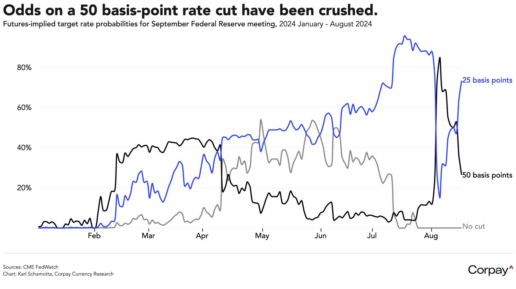 But the scale of the cut and the pace of subsequent moves will remain up for debate. The title of the event – “Reassessing the Effectiveness and Transmission of Monetary Policy” – hints at the extent to which the economy has surprised observers, staying resilient in the face of the fastest tightening cycle in decades, and surviving repeated recession scares. Chair Powell is unlikely to put the central bank on a more aggressive easing trajectory without sustained evidence of a rollover in growth and employment, and investors may find themselves disappointed with the substance of his remarks, and odds on a jumbo-sized cut could decline further from today’s levels.