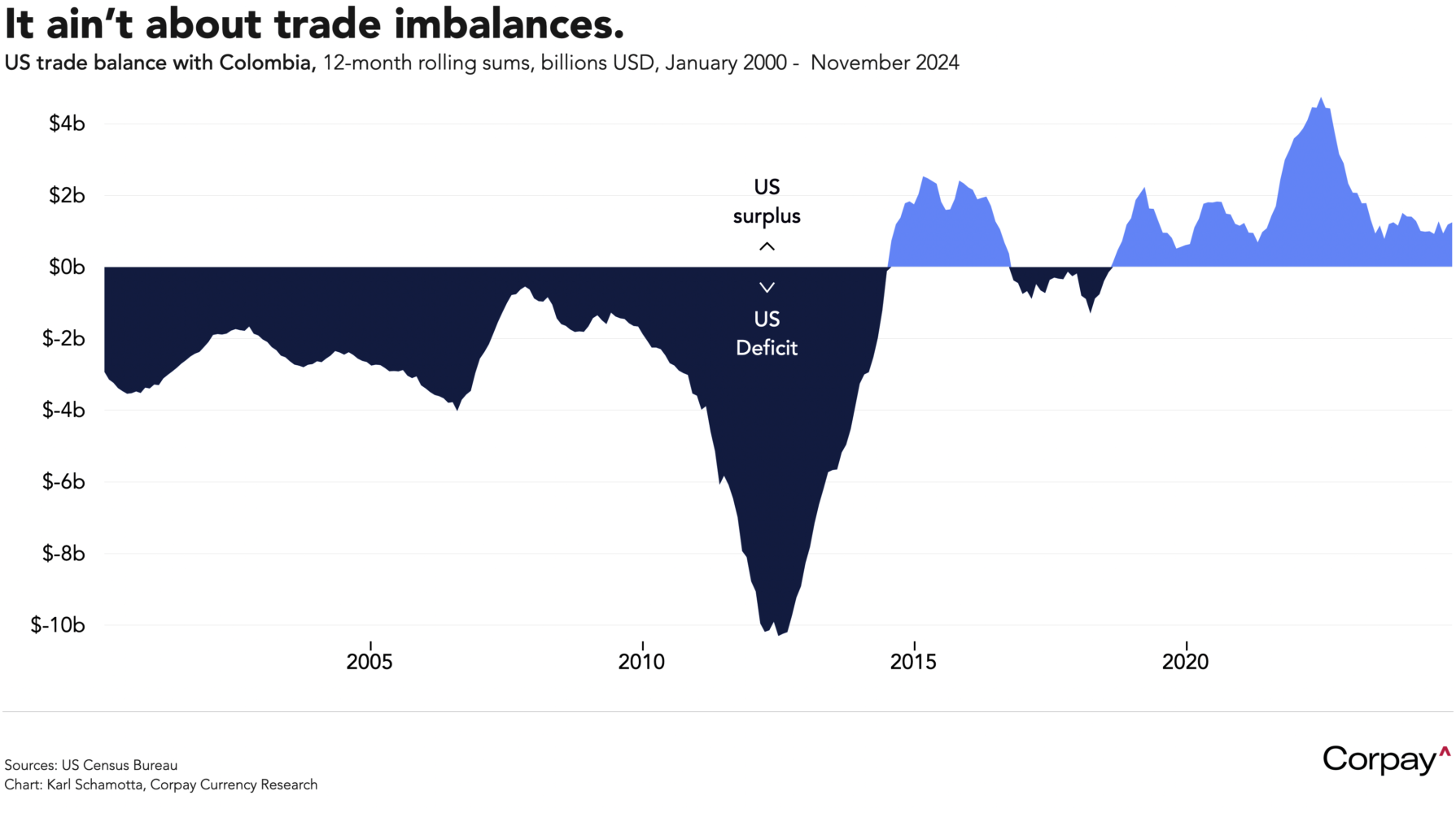 It might seem obvious, but the episode suggests Trump’s use of tariffs isn’t aimed at addressing trade imbalances, and that there are no meaningful hurdles to their implementation. The US has run a trade surplus with Colombia for many years, the president noted that he would apply tariffs and other sanctions under the International Emergency Economic Powers Act, and the domestic political negatives associated with hitting chocolate and flowers with substantial import taxes just two weeks away from Valentine’s Day** appear not to have dissuaded him in any way.