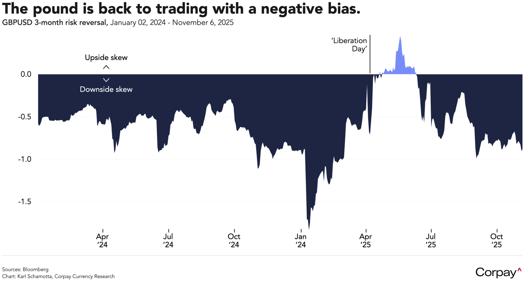 The British pound is paring its gains after the Bank of England left rates unchanged in a decision that opened the door to a move in the coming months. Officials on the central bank’s rate-setting committee voted by a 5-to-4 margin to keep the Bank Rate at 4 percent, but altered the statement language to acknowledge that policy was “likely to continue on a gradual downward path”. Governor Bailey noted that inflation risks had become “less pressing” since August, and Sarah Breeden warned that downside risks to demand “have become more prominent”. Traders are now assigning two-in-three odds to a cut in December, and are maintaining a bearish bias on the pound ahead of the government’s upcoming budget, in which Chancellor Rachel Reeves is expected to unveil a somewhat-deflationary mix of tax increases and spending cuts.