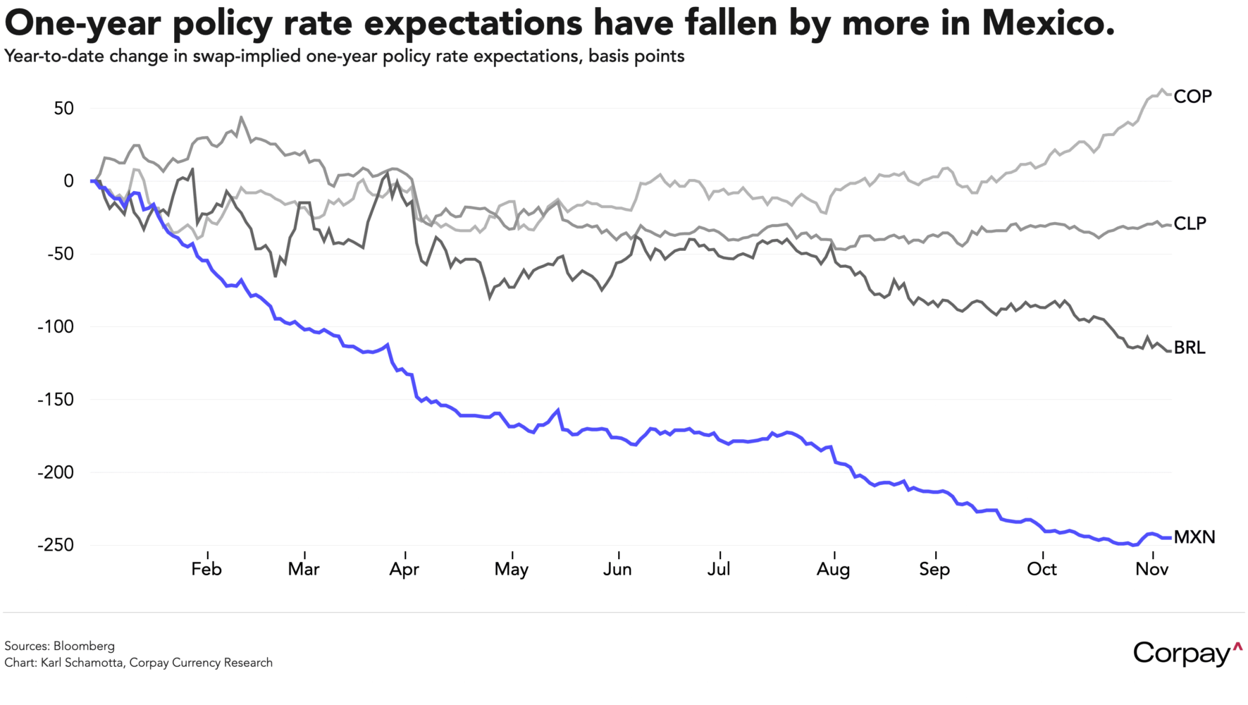 Markets expect Mexico’s central bank to deliver another rate cut this afternoon as inflation pressures ease and the economic outlook dims. Deputy Governor Heath, an inflation hawk, might dissent once again in favour of staying on hold, but the bulk of the committee should remain focused on downside risks to remittances, trade, domestic demand, and inflation, and are likely to vote for continued gradual easing. Year-ahead policy expectations have come down by more in Mexico than in other major Latin American economies this year, and we think prospective carry returns could erode by more in the months ahead as changes in US policy add to the structural headwinds facing the economy. The peso’s long run of outperformance seems doomed to fade, even if outright declines don’t materialise.