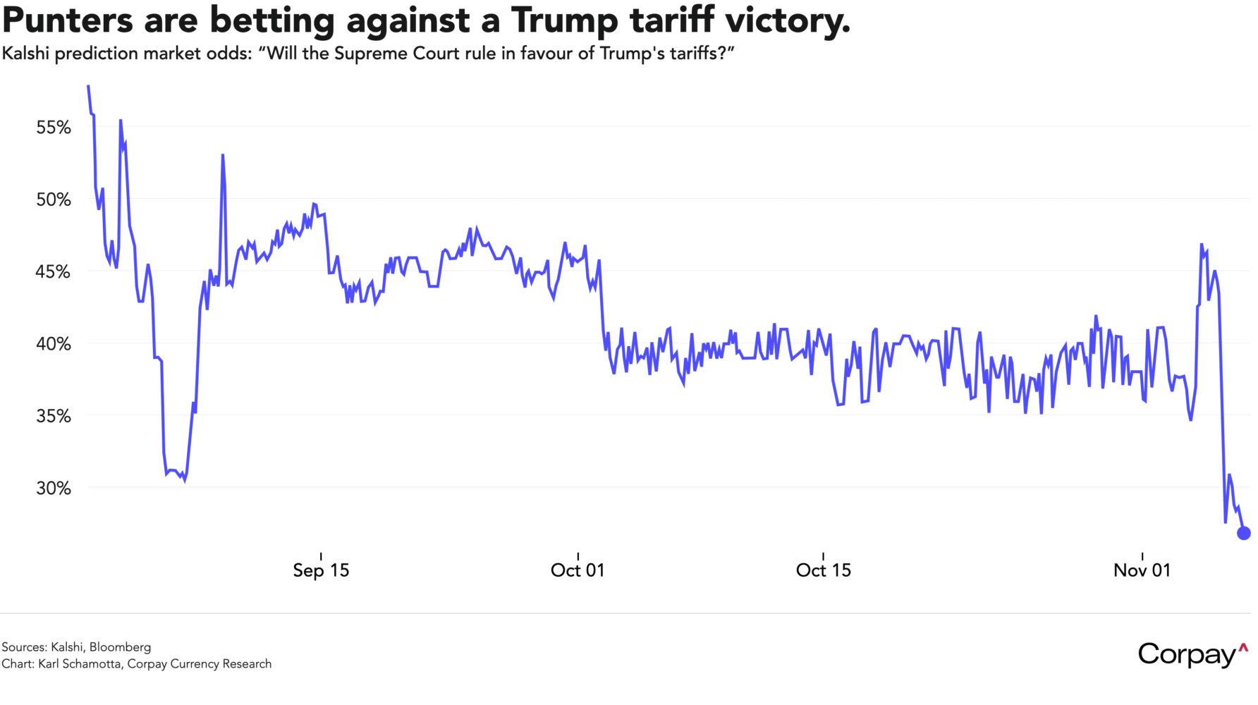 Yields and equity markets climbed during yesterday’s Supreme Court hearing on Donald Trump’s tariffs, suggesting that investors see a tax cut on the horizon. In the high-profile hearing, a number of justices—including those on the Republican end of the political spectrum—expressed deep reservations about the president’s expansive use of the International Emergency Economic Powers Act (IEEPA) and questioned whether a law intended for foreign policy crises could legitimately be stretched to usurp Congress’s constitutional control over taxation. A few seemed open to the administration’s national-security rationale, while others—including Chief Justice John Roberts and Justice Neil Gorsuch—warned against allowing emergency powers to serve as a backdoor expansion of executive power. No one knows what the verdict will be—and the discussion during introductory arguments can be deceptive—but prediction market odds on an administration victory plunged during the hearing, and haven’t recovered since.