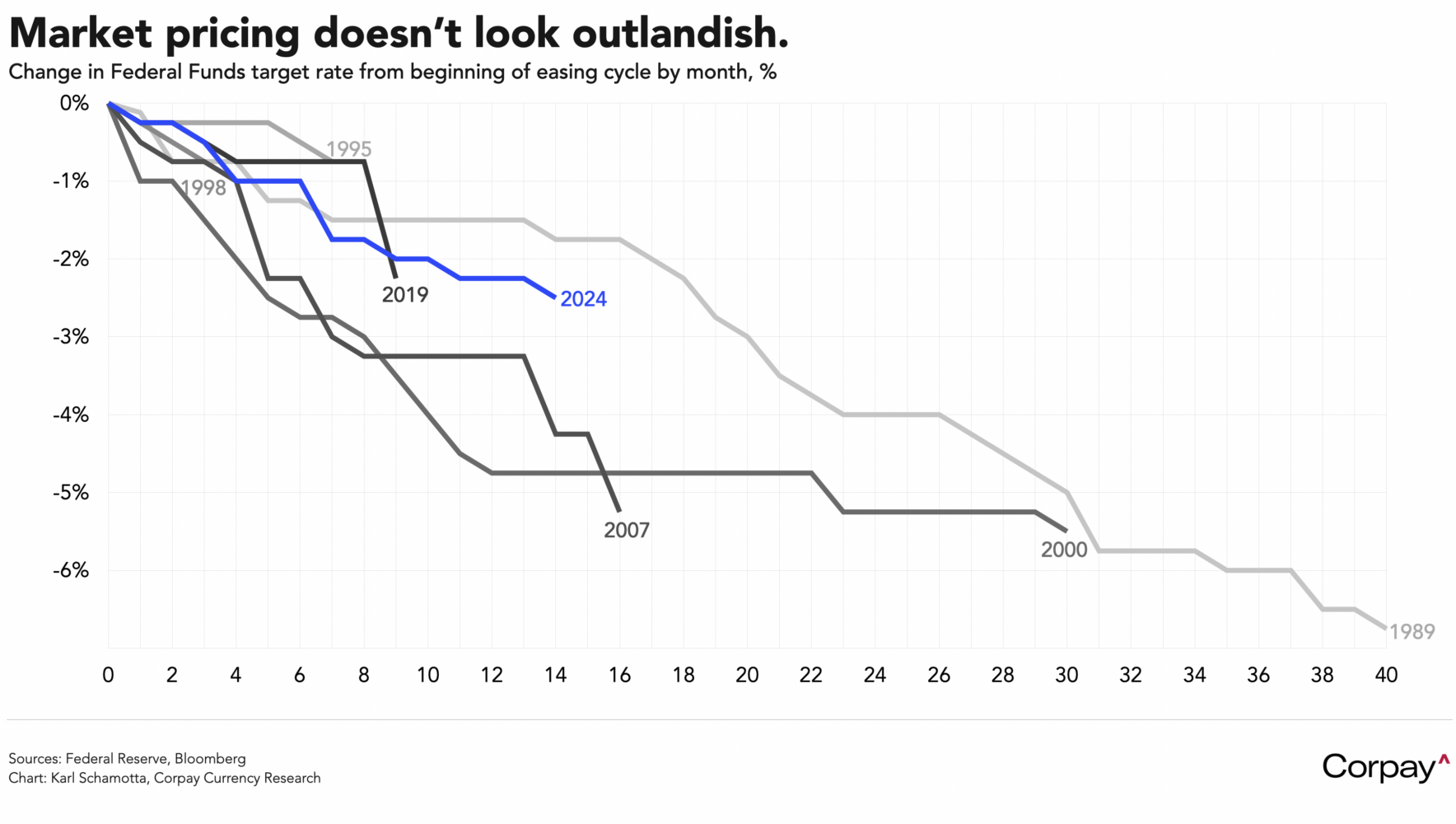 The futures-implied likelihood of a half-percentage-point move at next week’s meeting has climbed to 45 percent, up dramatically from 15 percent two days ago, but down from the 98 percent hit just after the July non-farm payrolls report landed in early August. We don’t have a high-conviction view on the size of the first cut, but we’re not sure it matters much: as it stands, investors expect a total of 10 quarter-point rate cuts between now and January 2026 – which admittedly seems extreme given that recession probabilities remain quite low – but isn’t terribly out of line with recent easing cycles. The greenback’s yield advantage is likely to shrink in the near term, even if policymakers initially opt to move more carefully.