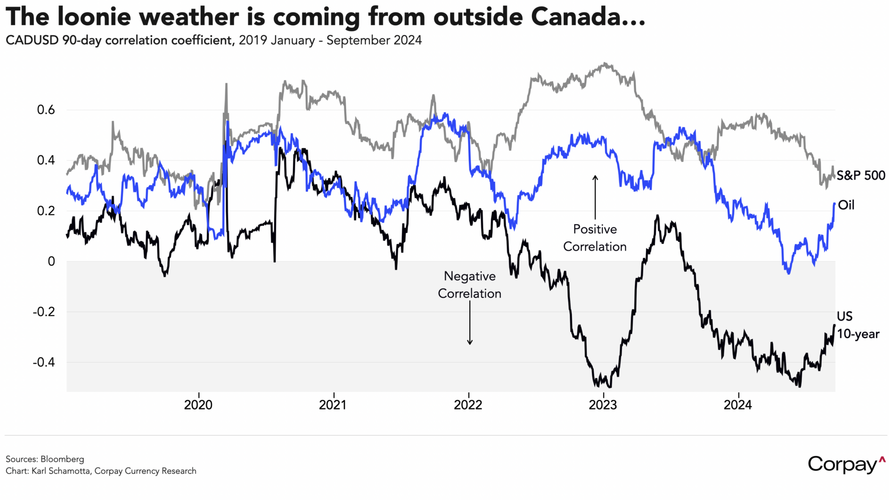 Early September’s tactical rebound in the Canadian dollar seems to have run its course, with this morning’s modest improvement in West Texas Intermediate prices doing very little to provide lift. As suggested yesterday, the currency’s correlation with the North American oil benchmark has risen in recent weeks, but hasn’t yet displaced much tighter relationships with the S&P 500 – or the US ten-year Treasury yield – which remain far more important in driving price action.