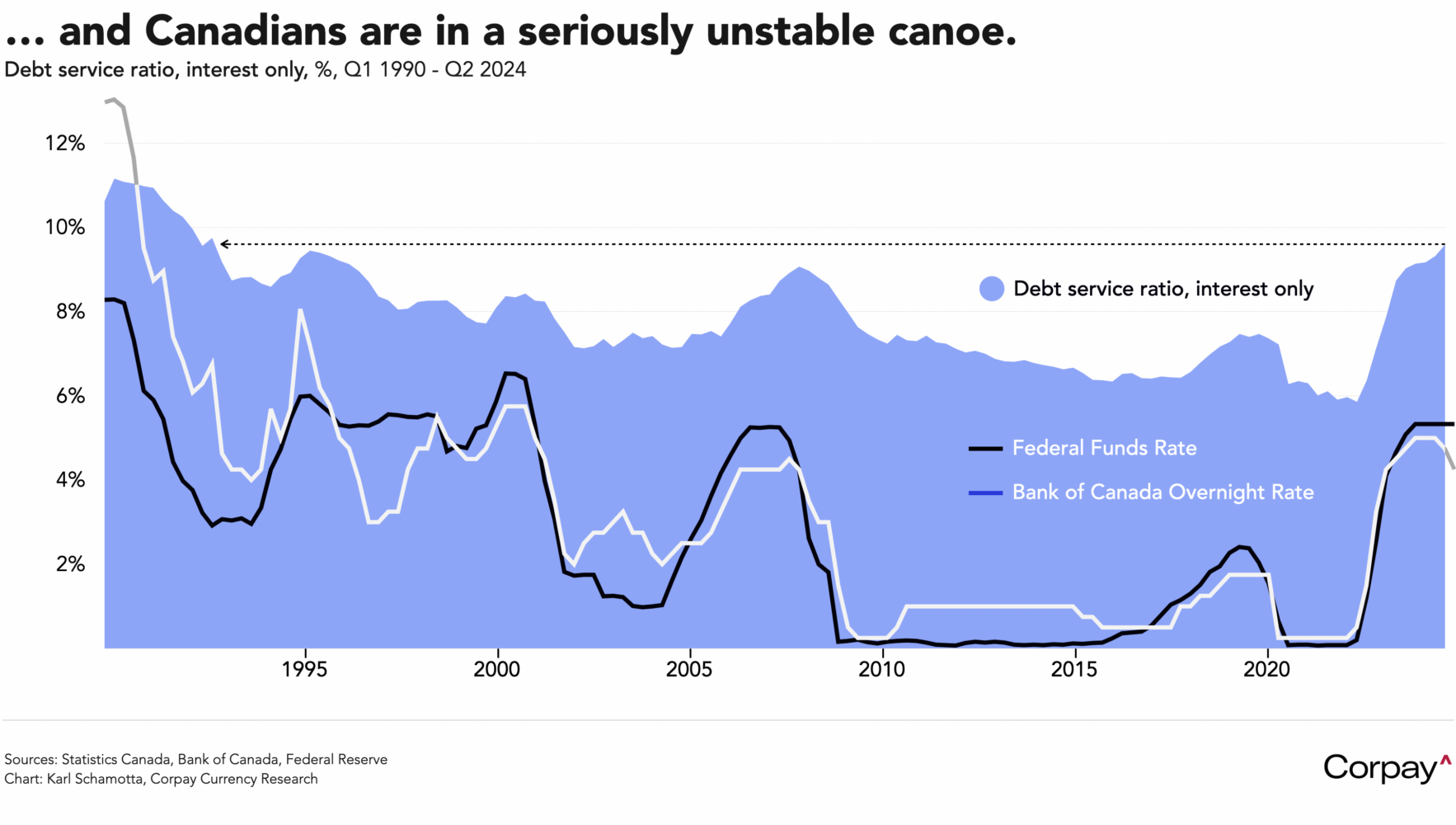 As a small, open economy with an extraordinarily-indebted household sector, Canada is exceptionally sensitive to changes in global risk appetite and interest rates – both of which are primarily determined in US financial markets. This was exemplified in data released yesterday, which showed interest payments swallowing 9.59 percent of household disposable incomes in the second quarter, hitting levels last seen in 1992, and reflecting both the large denominators involved – Canadian consumers owe more as a share of gross domestic product than their counterparts in any other G7 country – as well as the sharp increase in global borrowing rates that has occurred over the last year. It remains difficult to imagine consumer spending rebounding in a meaningful way as long as global interest rates remain elevated, and the country’s vulnerability to shifts in cross-border capital flows will likely remain acute until a deleveraging cycle has run its course, meaning that the Canadian dollar will continue to dance to a tune played elsewhere.