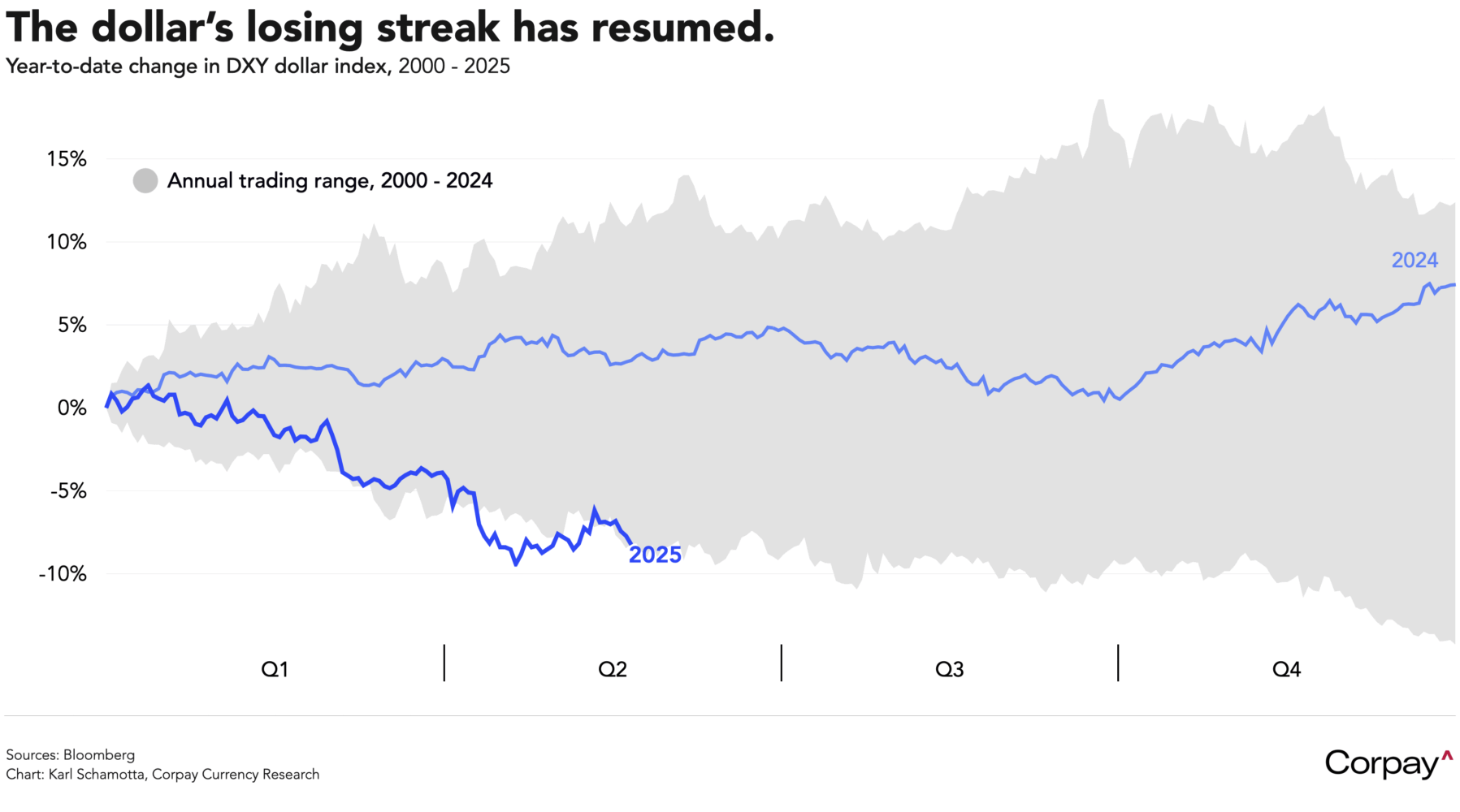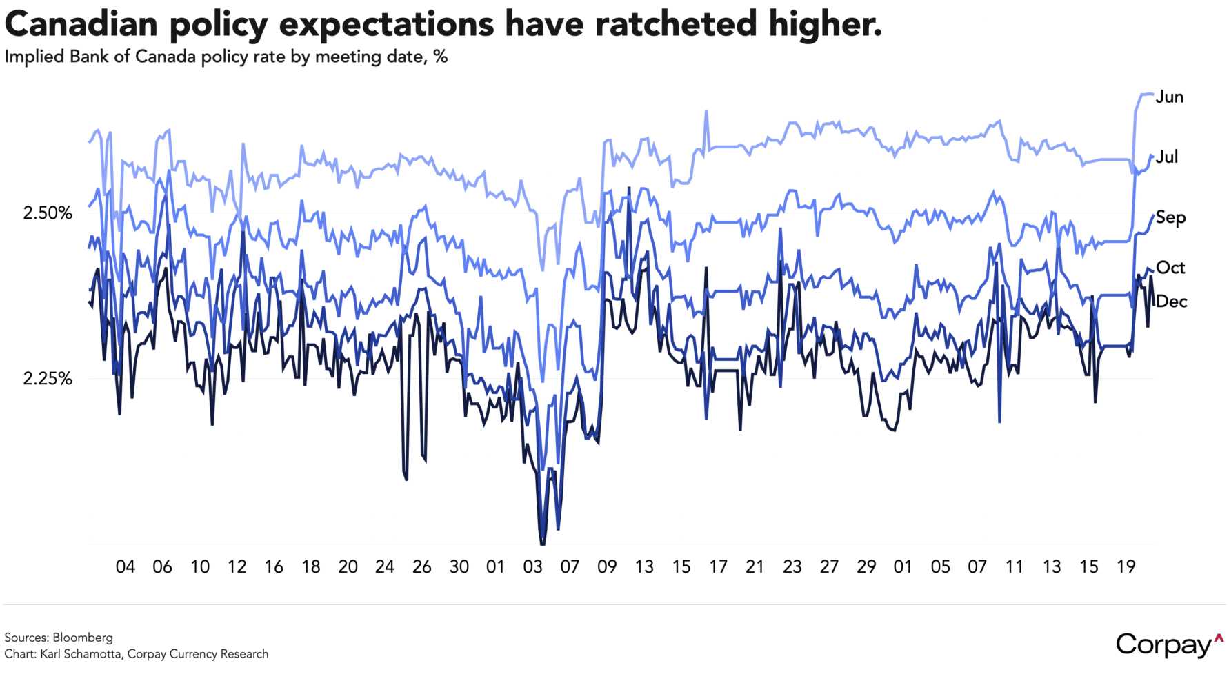 Here in Canada, the loonie is trading on a firmer footing after data released yesterday showed underlying inflation accelerating in April, potentially forcing the Bank of Canada to move more cautiously in the coming months. The central bank’s preferred “core” consumer price measures — trim and median — both climbed 0.4 percent last month, rising 3.1 and 3.2 percent in year-over-year terms respectively, rising at the fastest pace since early 2024. Tariff effects may have driven imported food and auto costs higher, but a range of services-sector categories also saw larger-than-anticipated increases, pointing to still-resilient demand among Canadian consumers. Investors have pushed expectations for the next rate cut out to September from July, and rate differentials have narrowed in the Canadian dollar’s favour.