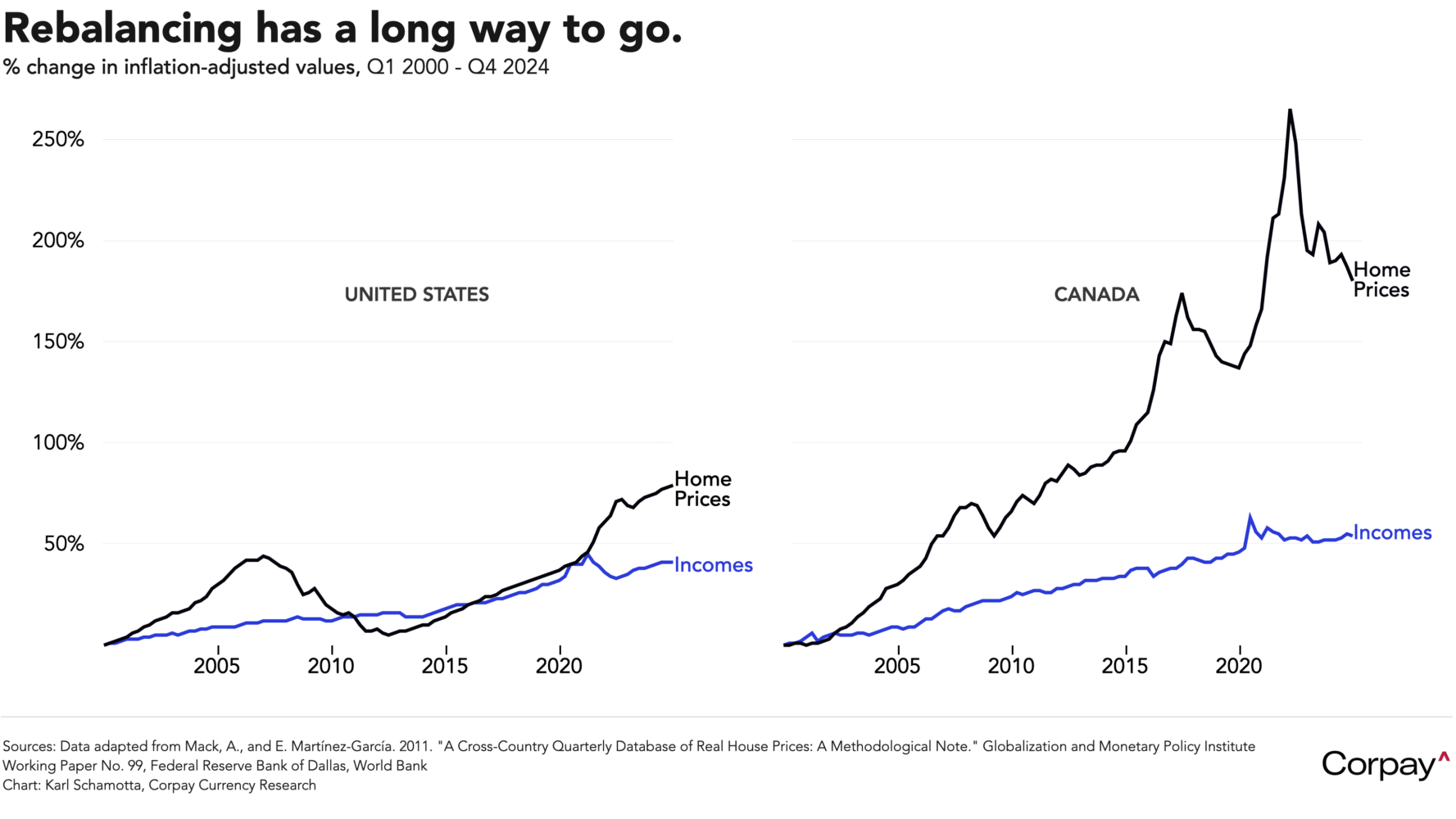 The outlook is cloudy. On one hand, Canada is now one of the countries with the lowest US tariff rates — no “reciprocal” or “baseline” levies are in effect — Mark Carney’s government looks set to deliver a heavy dollop of fiscal stimulus in the years ahead, and the lagging impact of last year’s easing cycle is percolating through the economy. Growth could surprise to the upside in the coming months. But on the other, policy uncertainty is spectacularly high, business and consumer confidence levels are very weak, and net immigration flows are becoming less supportive of nominal growth. Perhaps most importantly, the real estate market – which outpaced real income growth and helped provide the foundation for debt-fuelled household consumption for decades – is showing clear signs of exhaustion, with homebuilding activity slowing, sales activity suffering, and prices coming down. We suspect more easing is on its way, even if the central bank chooses to proceed cautiously.