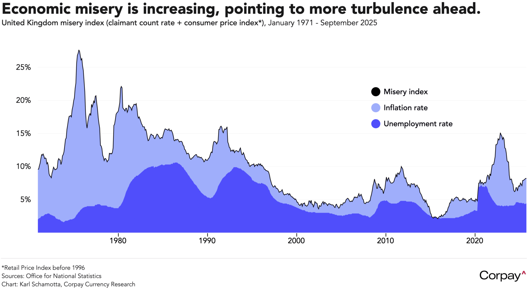 Across the Channel, the pound is climbing at a more sedate pace after an unexpected rise in unemployment reinforced market bets on more easing from the Bank of England by spring. According to data published by the Office for National Statistics yesterday, the official jobless rate climbed to 4.8 percent in the three months ended August, vacancies continued their decline, and regular private sector pay growth—closely watched by monetary policymakers—decelerated to 4.4 percent year-over-year from 4.7 percent in July. If inflation holds at last month’s levels, the UK “misery index”—the claimant count rate and inflation rate summed together—could continue to ratchet higher, putting pressure on elected politicians and central bankers to deliver stimulative measures in the months ahead.