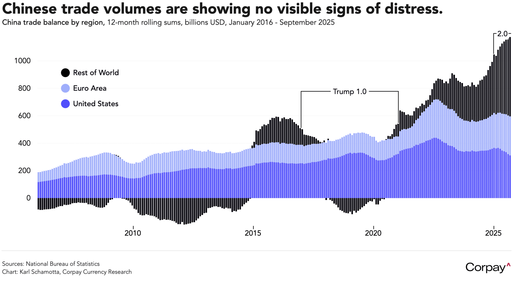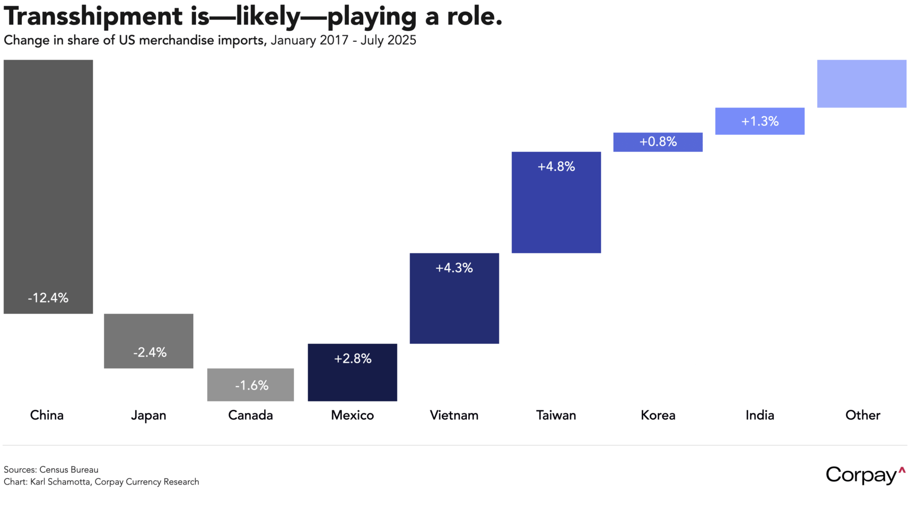 Consumption in non-US markets may be picking up some slack, but we suspect exports to the US are being re-routed through third countries to take advantage of relatively-lower tariff rates. It’s impossible to quantify the degree to which transshipment has played a role since Trump’s first term in office—that is, of course, the point—but it seems clear that massive increases in US imports from other Southeast Asian jurisdictions are representative of an opportunistic shifting in final assembly operations, as opposed to a realignment in the global production mix. To us, this means tensions between the world’s biggest and most imbalanced economies will continue to simmer for many years to come—and that markets will frequently find themselves squeezed in the middle.