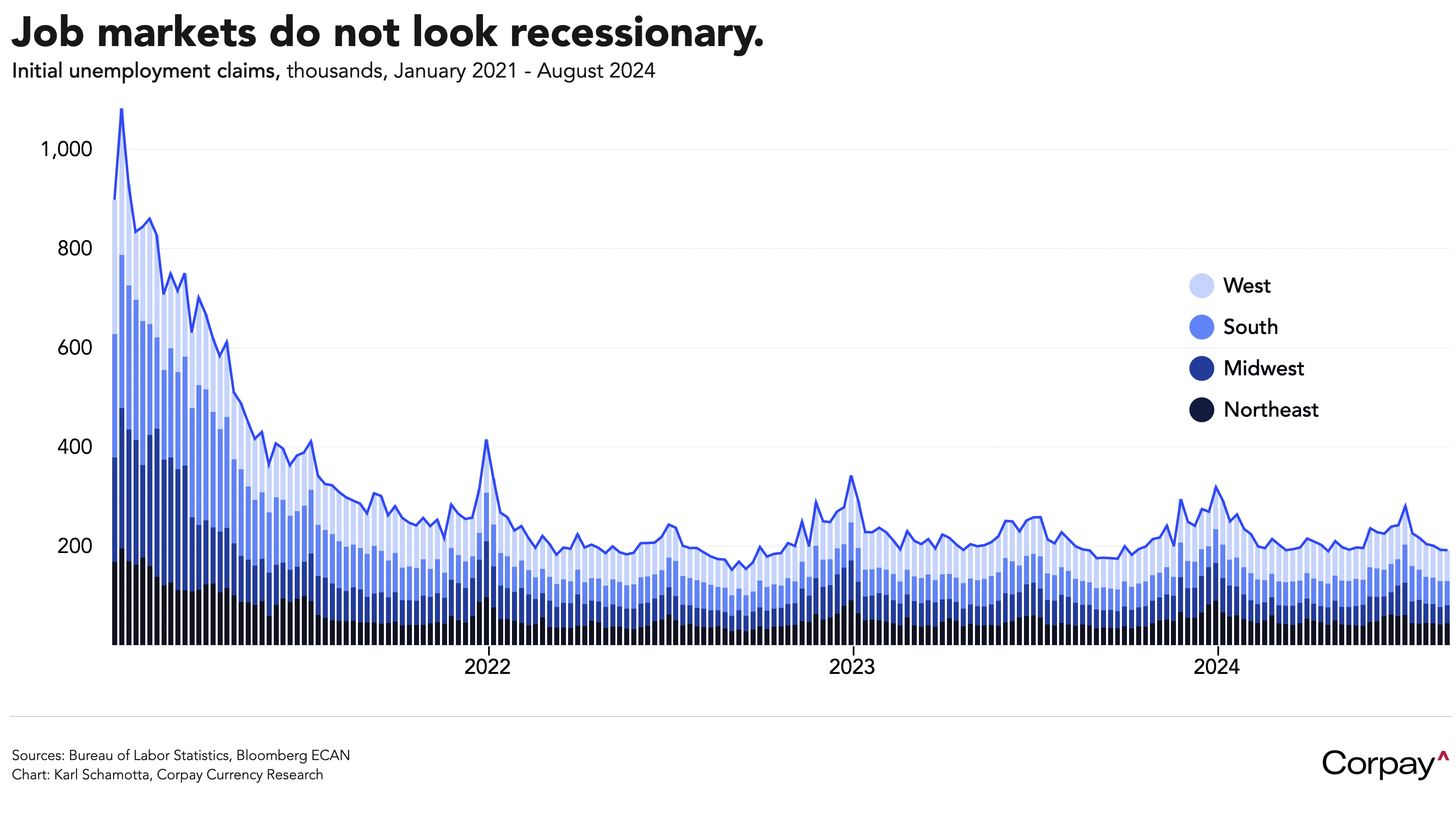 The dollar looks set to close out August on a slightly stronger footing as signs of economic resilience help bolster the case for a more cautious rate-cutting cycle from the Federal Reserve. Treasury yields are ratcheting incrementally higher, stock markets are advancing – led by the biggest technology names – and most major currencies are trading sideways ahead of the North American open.