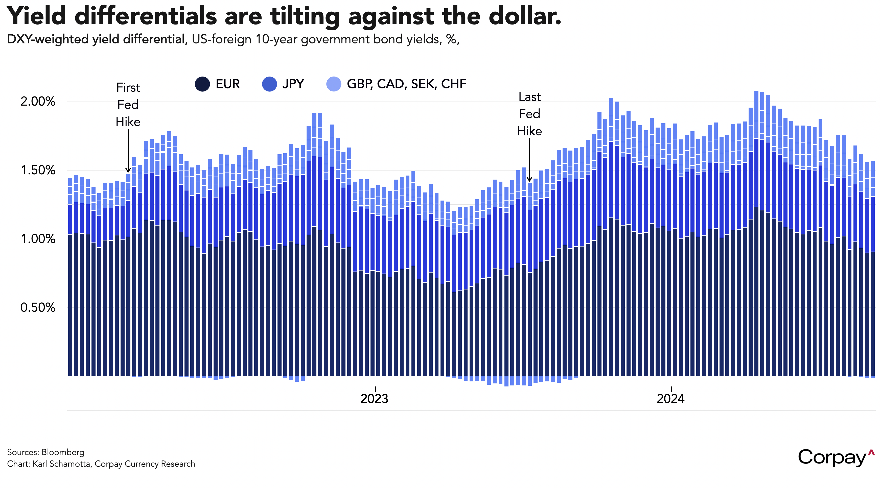 But markets remain convinced that the Fed will deliver at least four rate cuts over the next three meetings, and interest differentials have narrowed against the dollar across the curve. Among the major currencies included in the DXY dollar index*, British pound-denominated ten-year government bonds now yield more than their US counterparts, and the dollar’s rate premium over the euro, yen, loonie, Stokkie, and Swissie has eroded substantially in the last month.