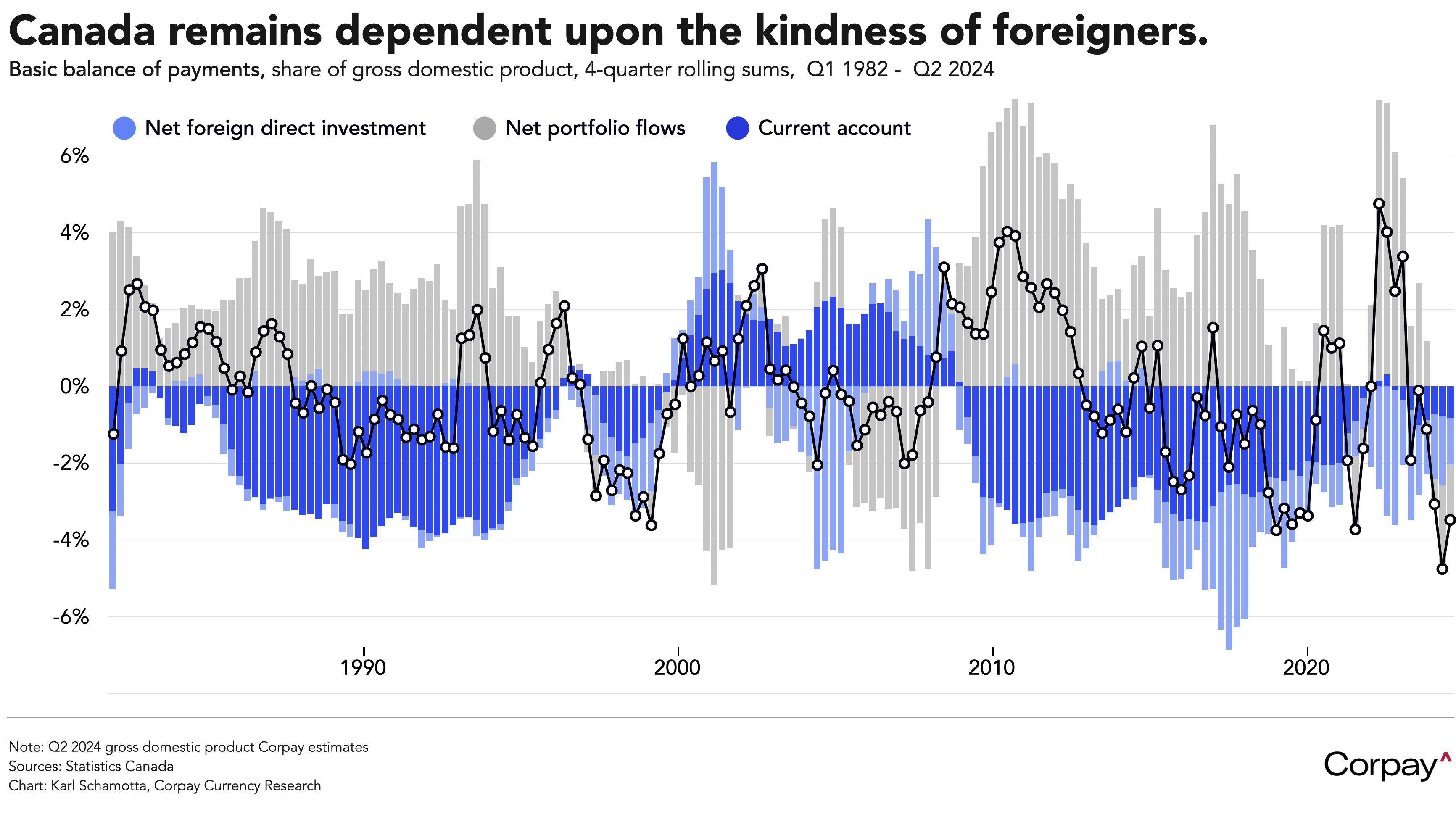 But the Canadian dollar’s ‘risk proxy’ status looks likely to remain intact. Canada’s second-quarter balance of payments data – released yesterday – showed the country’s net basic balance, the broadest measure of capital flows, remaining negative for the currency, amounting to roughly -3.5 percent of gross domestic product, if our output estimates are correct. The current account remained firmly in deficit territory for an eighth consecutive quarter, net direct investment hit its highest levels since 2007, and Canadian governments and corporates sold $67.3 billion in bonds to foreign investors, reflecting a heavy dependence on external funding. If global economic and market conditions turn more turbulent in coming months, the loonie could find itself on the firing line yet again.